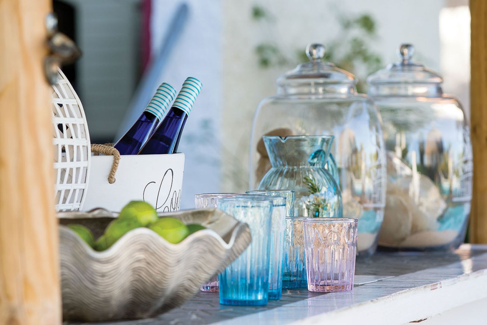 W stu procentach kojarzą się z przyjemnymi wakacjami nad morzem. Są tu poszewki na poduszki oraz pledy Sandy Shores marki RiviÈra Maison w najróżniejszych odcieniach piasku, z delikatnej bawełny. Producent mówi, że mają wywołać przyjemne uczucie „soli we włosach i oblepionych piaskiem stóp”, czyli pełnej beztroski gorącego dnia. Do tego porcelanowe talerze, koszyczki i deski do krojenia w kształcie ryb. Jest solniczka i pieprzniczka w formie latarni morskiej czy taca z motywem muszli z uchwytami z liny okrętowej, idealna do noszenia drinków, deserów i wszystkiego, czego potrzeba człowiekowi w pozycji horyzontalnej. Do kompletu nie może zabraknąć szkła w turkusowym odcieniu, takim, jaki przybiera najczystsze morze w najbardziej pogodny dzień lata.