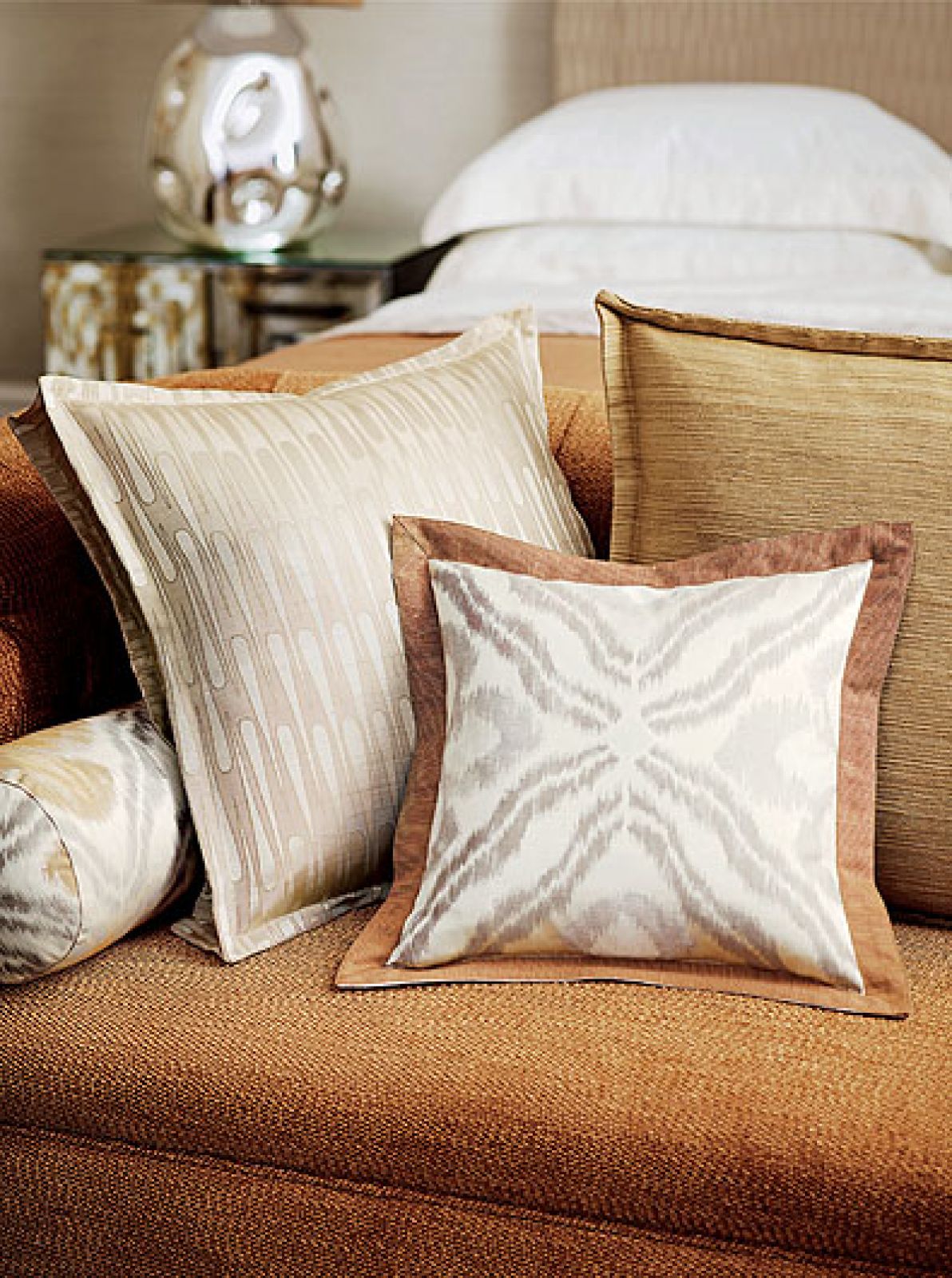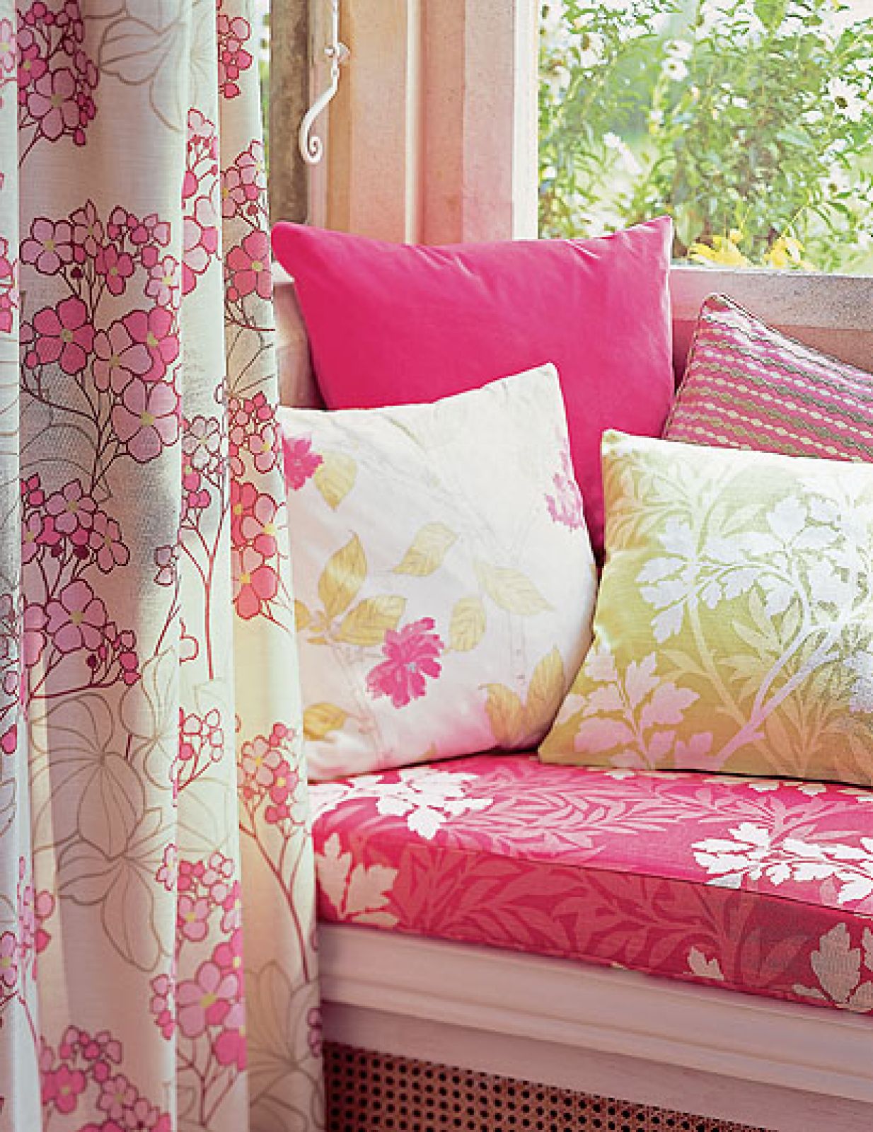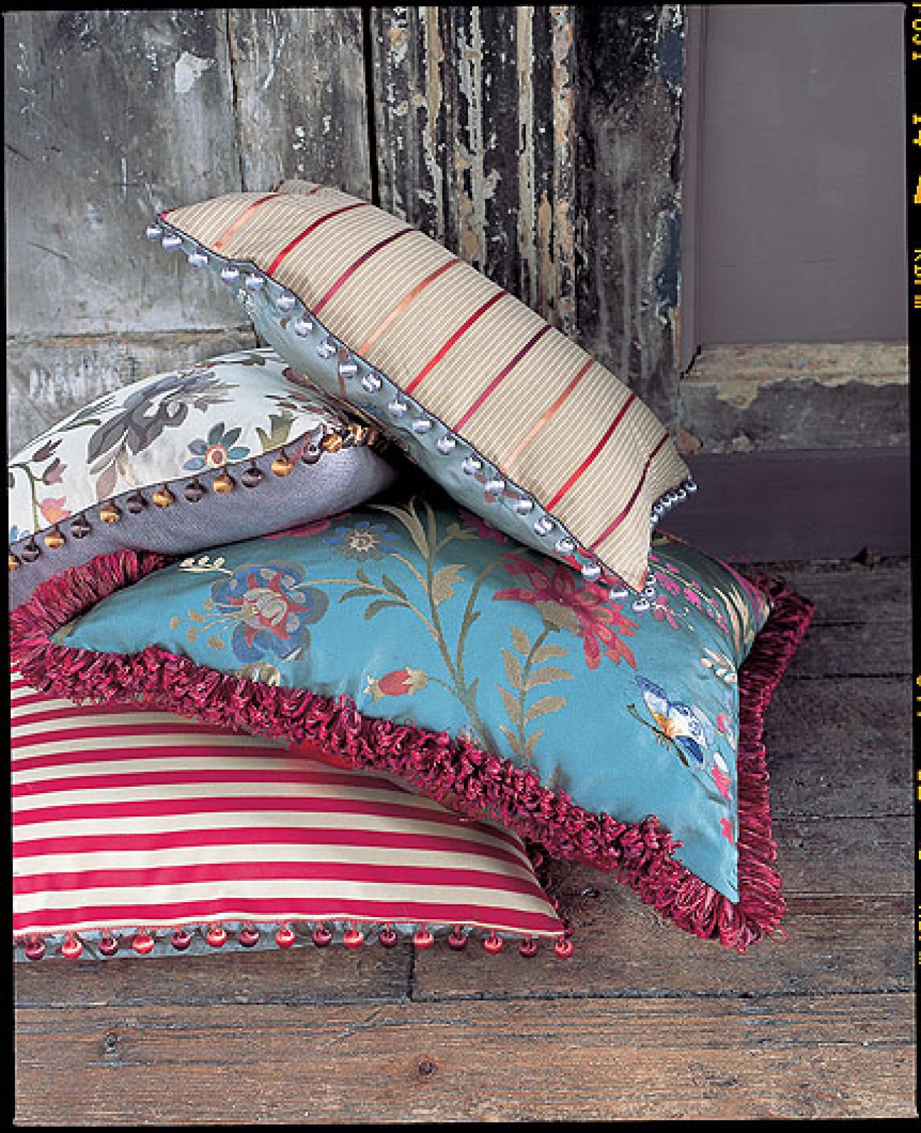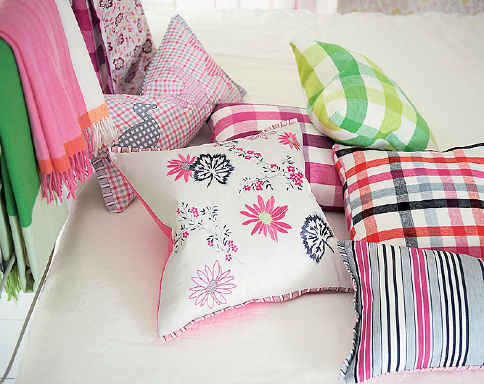Poduszki piętrzą się na kanapach, fotelach, leżą na dywanie. Nie obowiązują ich żadne reguły gry – prostokątna ma się świetnie obok kwadratowej, a nawet wśród wałków. Są bardzo tolerancyjne; dają pełną swobodę w dobieraniu kolorów i tkanin. To, co na pierwszy rzut oka do siebie nie bardzo pasuje, w wielobarwnym tłumie wygląda świetnie. Odważnie więc łączmy kraty i kwiaty, pasy, falbany, szorstkie faktury z miękkimi i gładkimi. Ale… choć można wiele, w tej różnorodności znajdźmy wspólny mianownik, na przykład jeden rodzaj tkaniny, który złagodzi szaleństwo kolorów i kształtów.