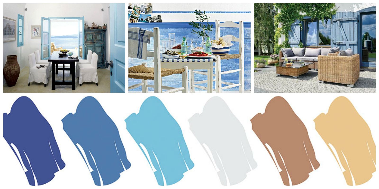 Najważniejsze to: niebieski, biały i barwy ziemi – od spokojnych beżów po ugry, ochry i sjeny. Pierwszy także może mieć różne odcienie – od bardzo jasnego po nasycony i ciemny czy jaskrawy wpadający w ultramarynę i kobalt. Co do bieli, przeważa odcień czysty, niezłamany.