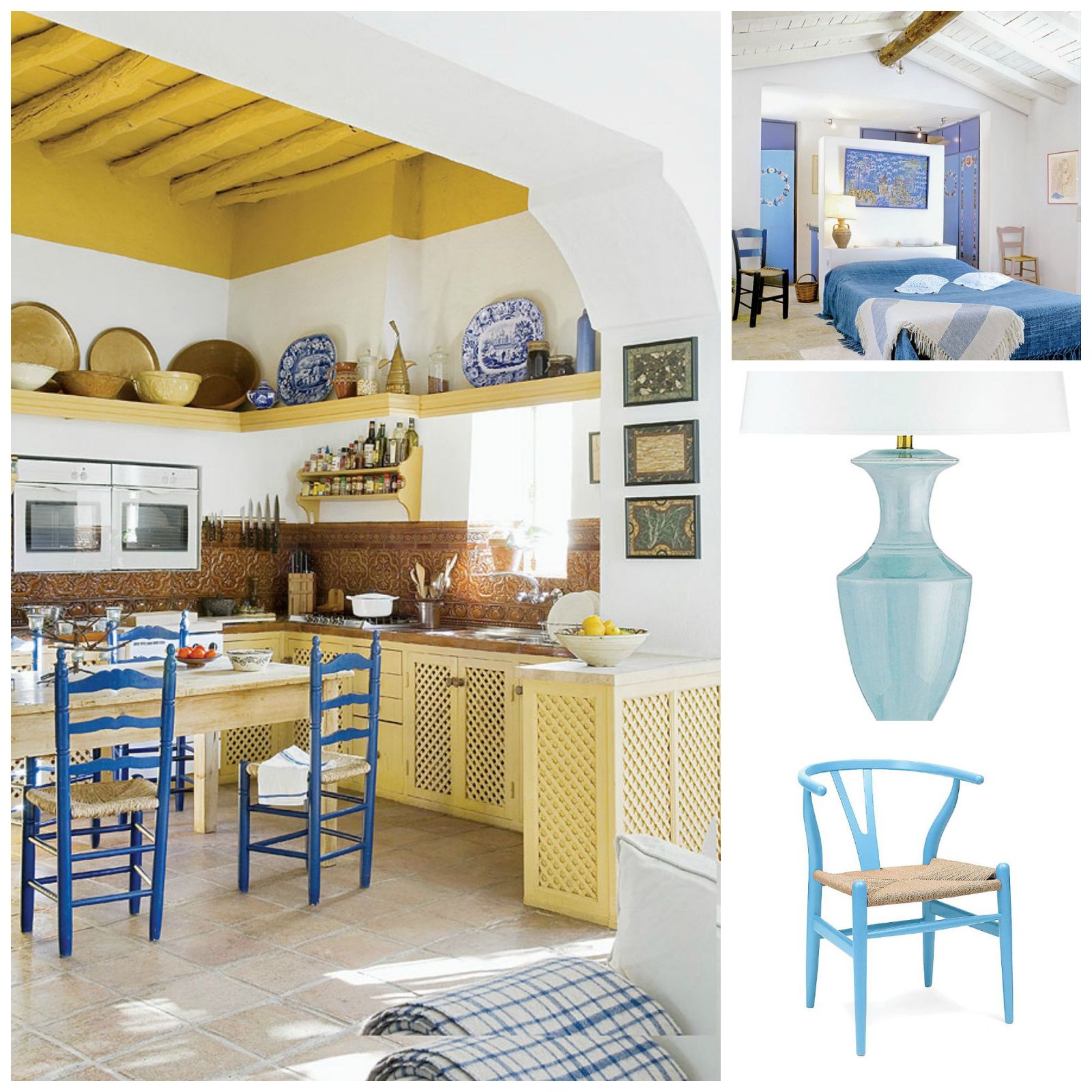 We wnętrzach często pojawiają się łuki i drewniane belki pod sufitem. W ścianach nisze grające rolę półek. Najbardziej charakterystycznym meblem jest krzesło z malowanego drewna, z plecionym siedziskiem. W kuchni powinien stanąć stary kredens, najlepiej bielony. Pasują do niego też inne wiekowe meble malowane na biało albo niebiesko. Proste stoły i ławy.