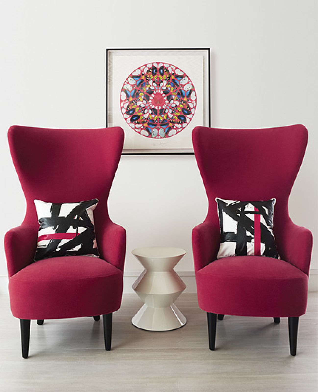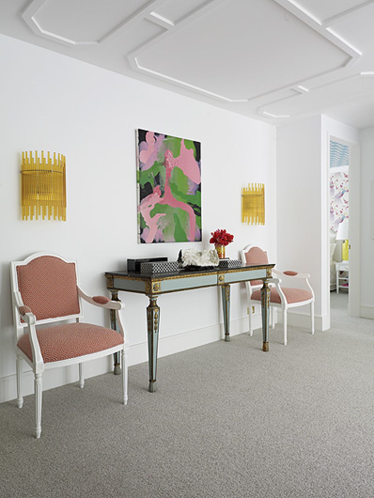 Znak rozpoznawczy to graficzne dywany – Greg współpracuje z firmą Designer Rugs, w swoich projektach często wykorzystuje desenie retro. Do tego monochromatyczne tło. – Klienci zazwyczaj proszą o beże, ja wolę czerń i biel, są bardziej eleganckie, lub szarości – tłumaczy. Jego wnętrza zbliżają się do popularnego od kilku lat Hollywood Regency, stylu, który w latach 30. pokochały gwiazdy dużego ekranu i wyższe sfery Ameryki. W ich rezydencjach nie brakowało oryginalnych chińskich waz, kryształowych żyrandoli, jedwabnych abażurów z frędzlami, welwetowych draperii. Wyobrażenie o tamtym świecie daje najnowsza ekranizacja „Wielkiego Gatsby’ego”.