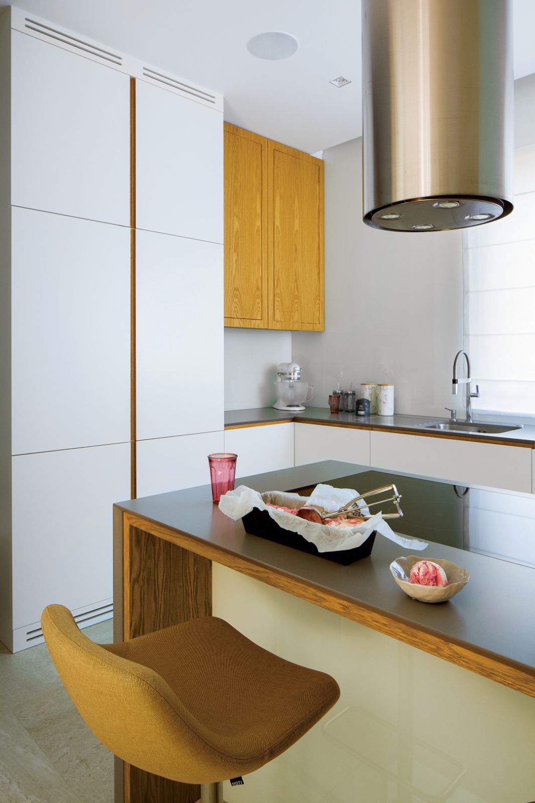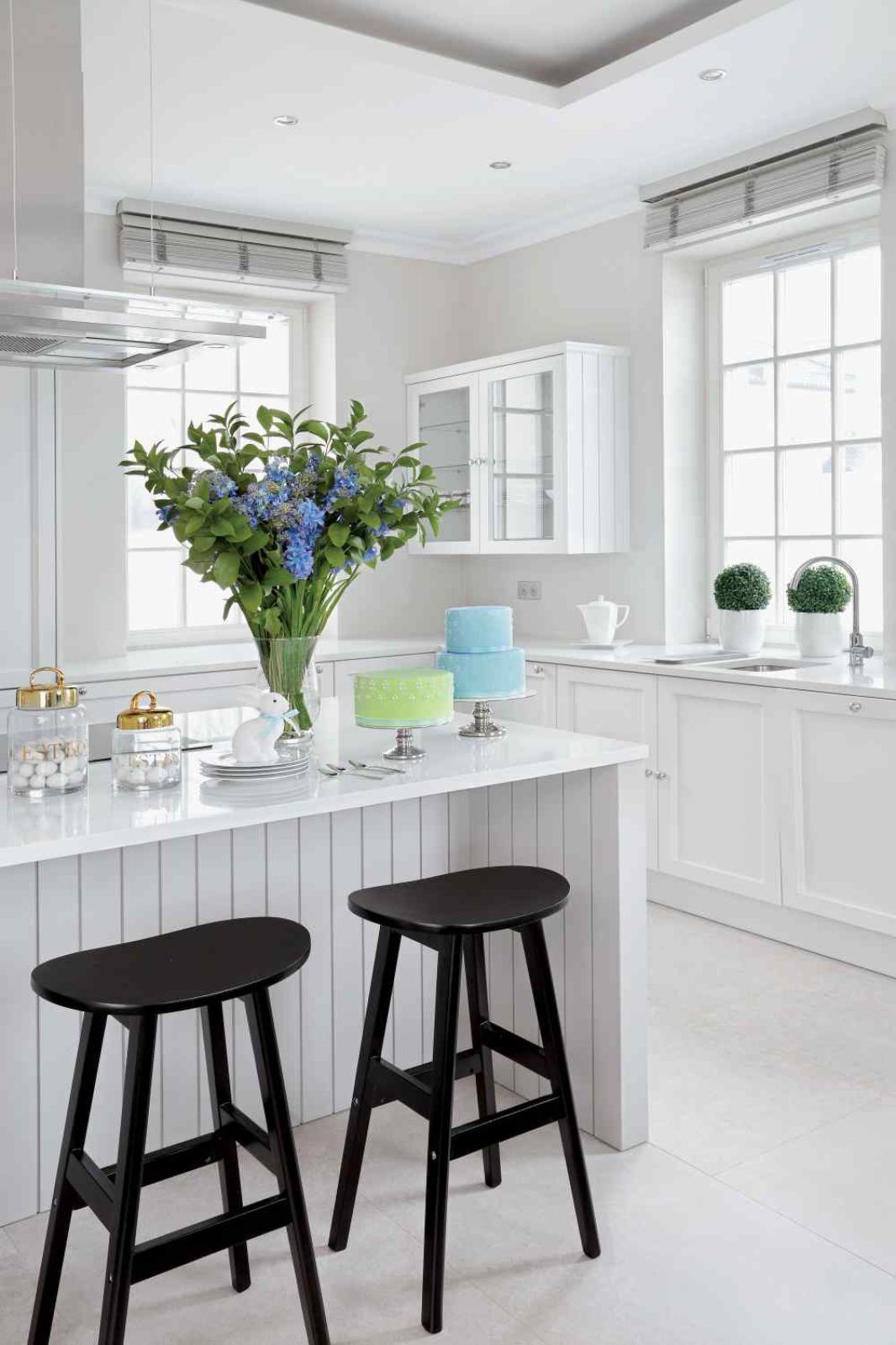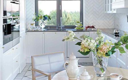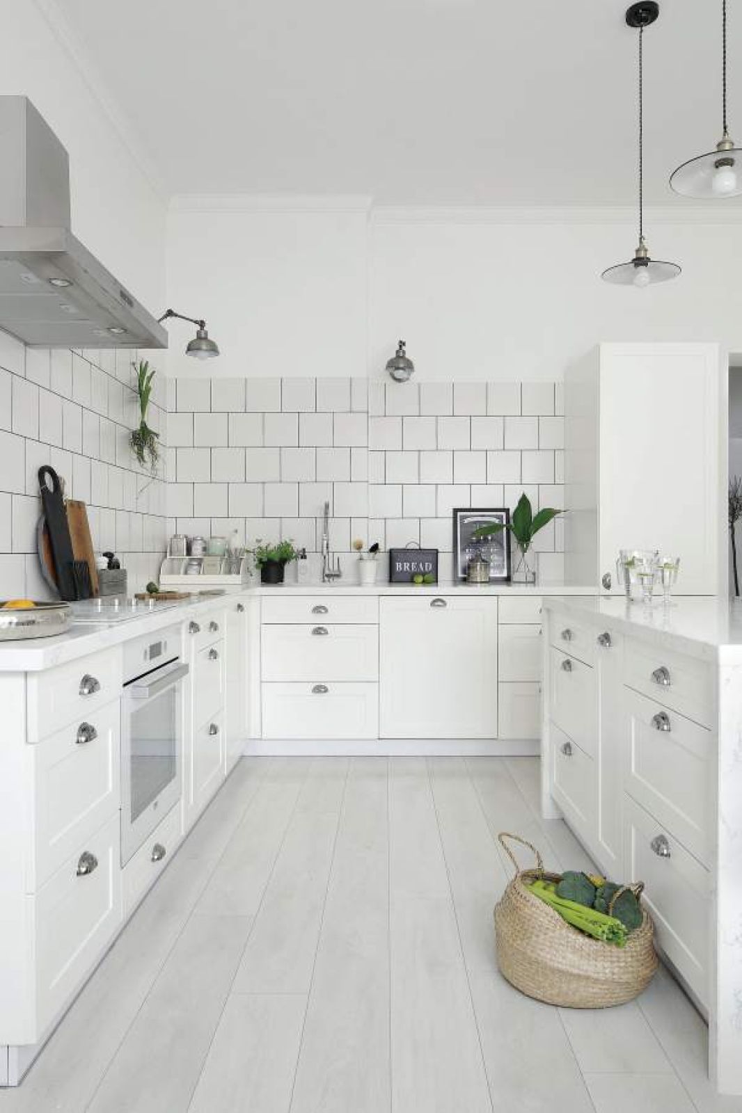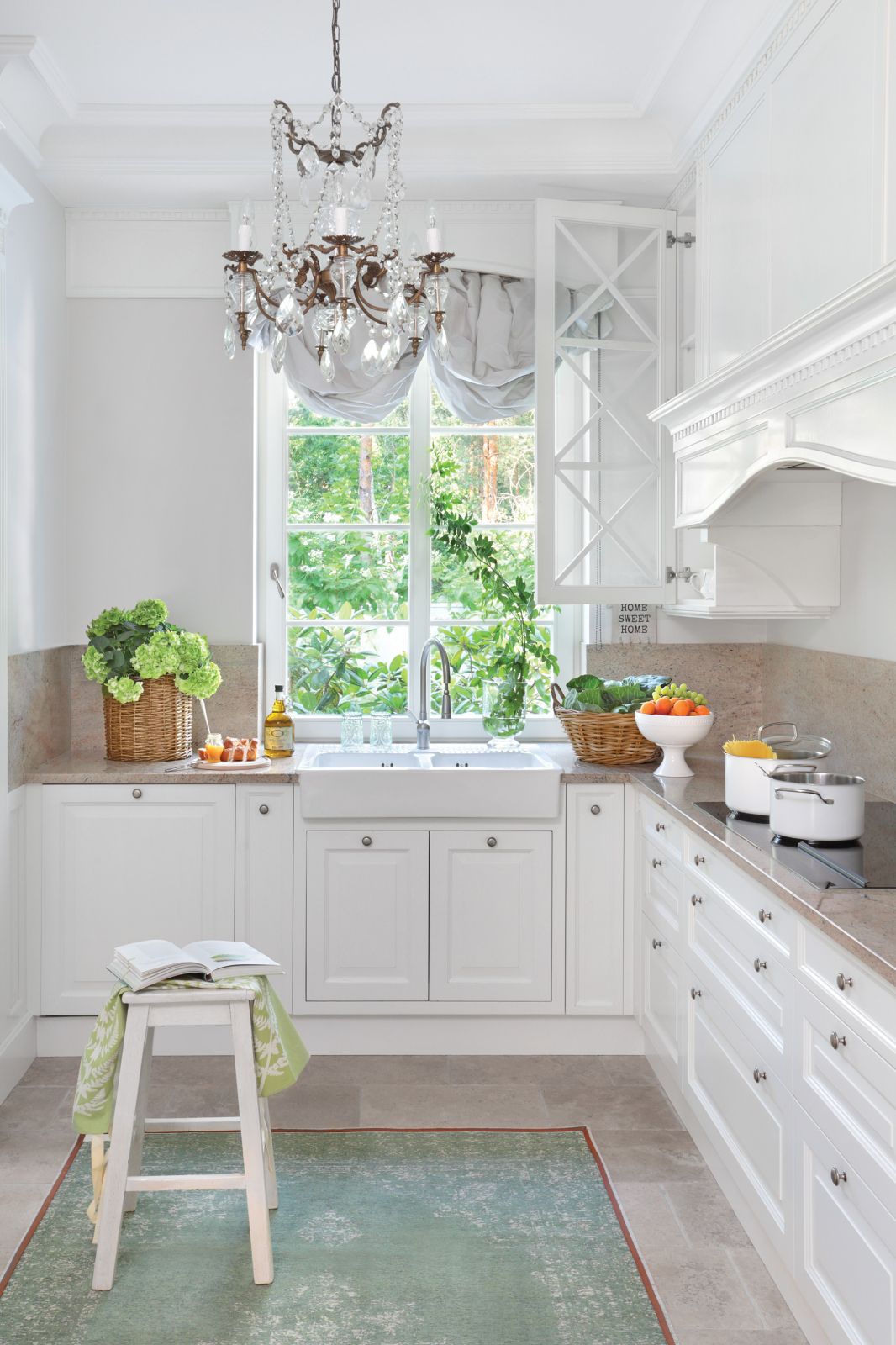To prawdziwa pochwała klasyki. Kuchnia cała w bieli – od podłogi, przez meble, kolor blatu, płytek po kolor ścian oraz sufitu – to najbardziej ponadczasowa elegancja, a do tego aranżacja niezwykle lekka i świetlista. Wspaniale prezentuje się we wnętrzach skręcających w stronę francuskich czy prowansalskich. Chcąc wprowadzić nieco zaskoczenia można pobawić się wykończeniem mebli w macie lub połysku.