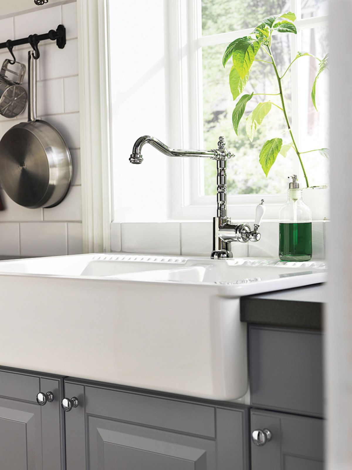 Jeśli lubimy klasykę, ale i dobre wzornictwo, zdecydujmy się na zlew New Wave od Villeroy & Boch. – Jest ceramiczny, jak w bogatym mieszczańskim XIX-wiecznym domu, a kształtem nawiązuje do porcelany z charakterystyczną falą – opowiada marketing manager marki, Magdalena Usar. – Do wyboru jest siedemnaście kolorów, od szarości, przez cappuccino, po czarny – dodaje. Do tego pasuje skromna bateria w kolorze szczotkowanej stali, takiej jak kratka odpływu.