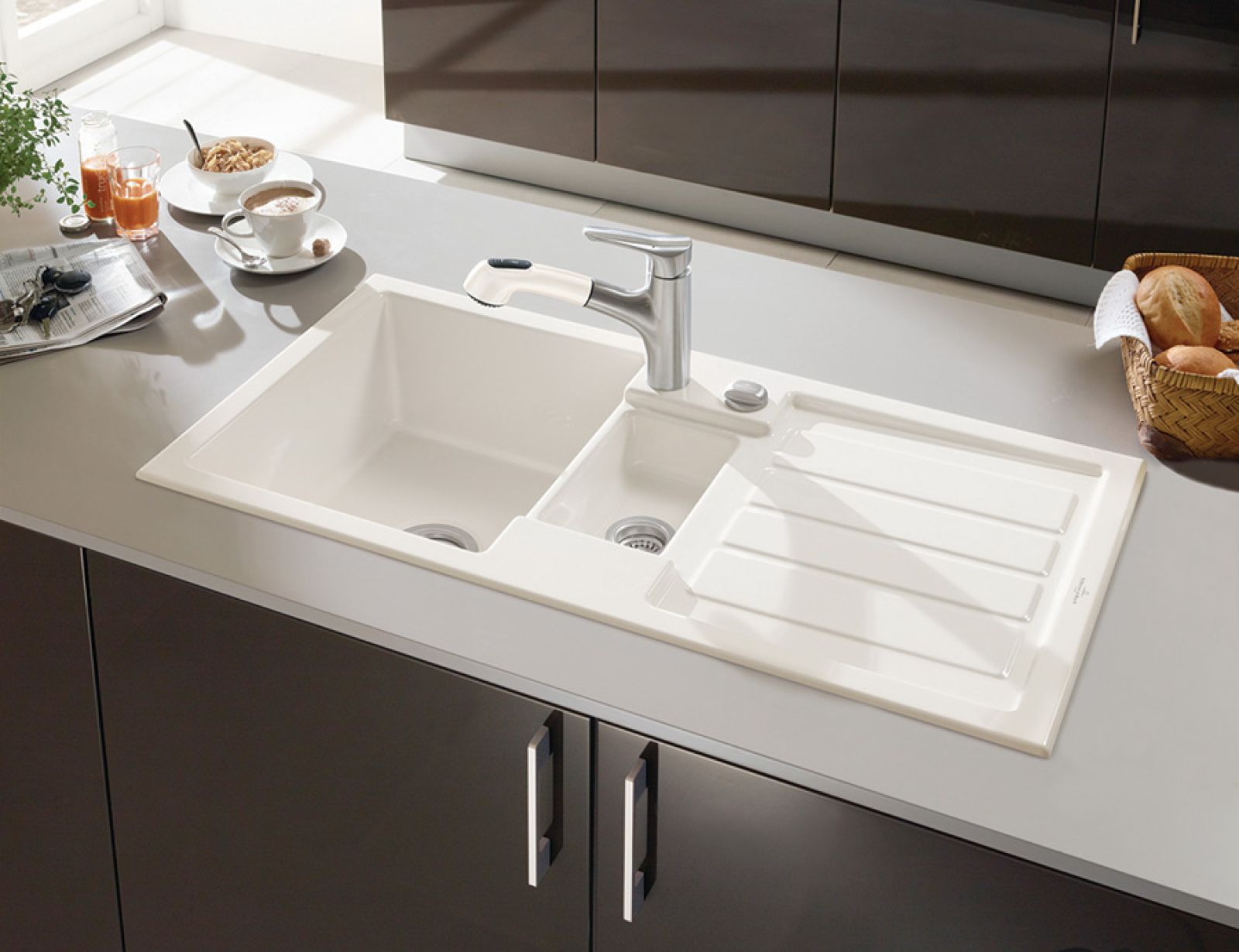 Zlewy ceramiczne wypalane są w temperaturze 1200°C, więc postawimy na nich wyjętą z pieca gorącą brytfankę i nic się nie stanie. Często pokrywane są specjalną powłoką (np. ceramicplus jeszcze przed wypaleniem zlewu Villeroy & Boch), na której nie osadza się kamień, a kropelki wody spływają jak po wosku.