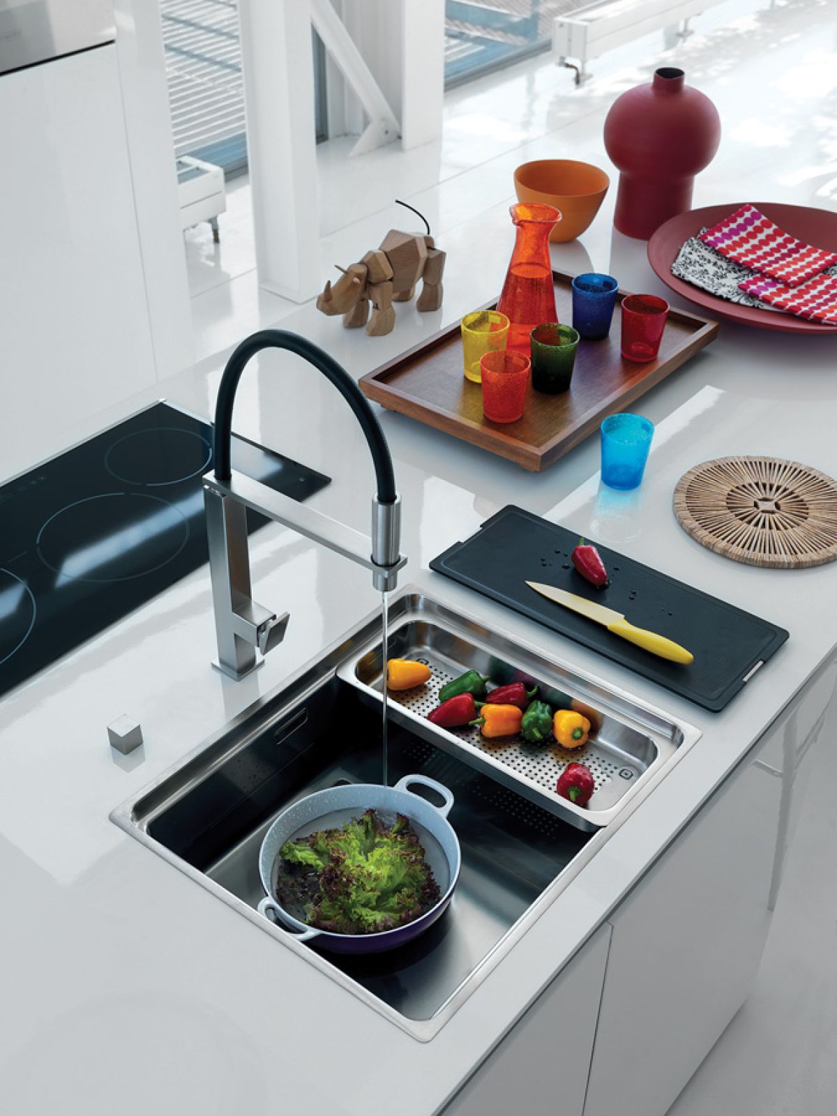 Jeśli mieszkamy i gotujemy nowocześnie, wtedy niezastąpiony będzie modny zlew ze stali szlachetnej Centinox marki Franke, nagrodzony prestiżową Red Dot Design Award. Prosty, ale wyposażony w mnóstwo akcesoriów: eleganckie sitko dopasowane do kształtu komory, deskę do krojenia, pojemniczki na różne warzywa. Pasuje do niego bateria z elastyczną wylewką przypominającą prysznic, która ułatwia nalewanie wody do wysokiego garnka czy wygodne opłukanie sałaty albo zapiaszczonego pora.