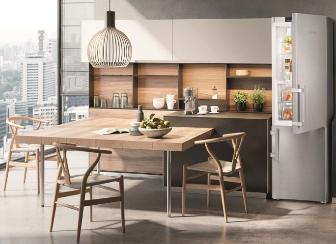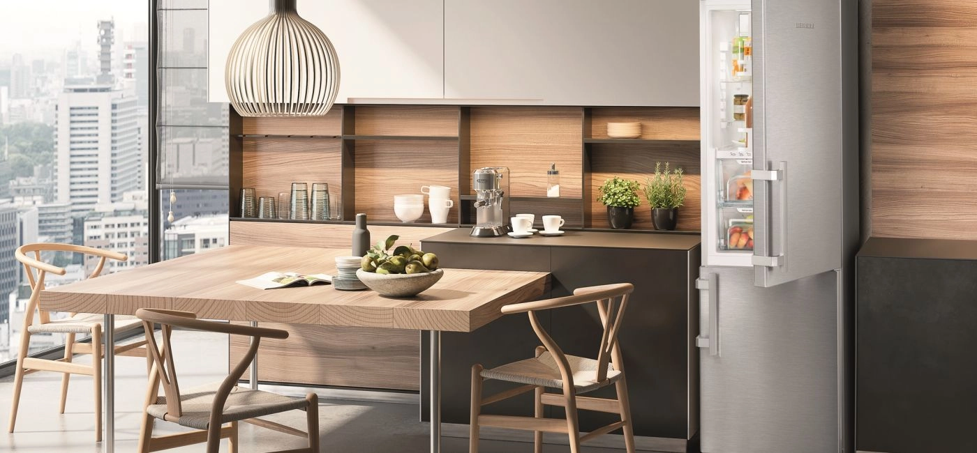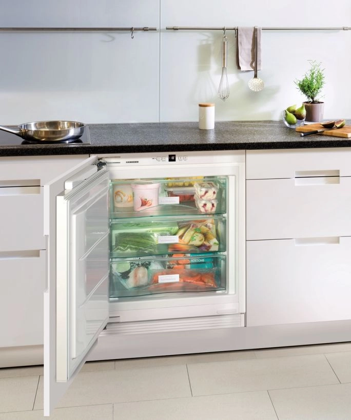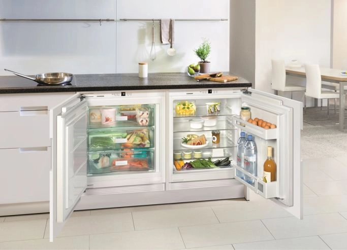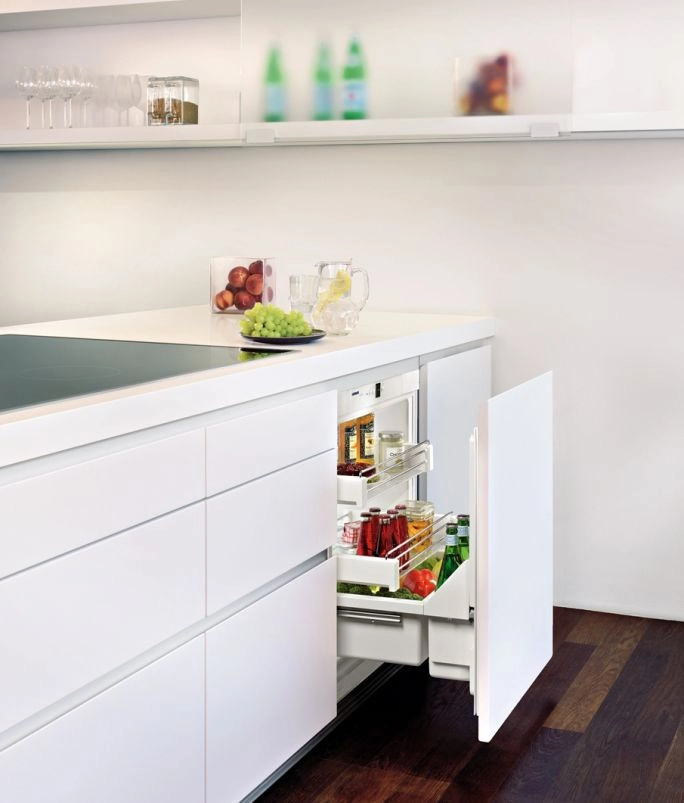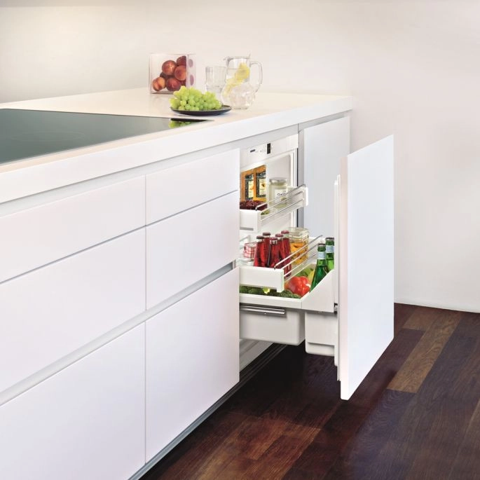 To, co zajmuje najwięcej miejsca w kuchni, czyli lodówka, też ma już zróżnicowane rozmiary, które możemy dopasować do naszych aranżacyjnych potrzeb. Świetnym rozwiązaniem w niewielkich kuchniach jest wybór mniejszych chłodziarek i zamrażarek podblatowych do zabudowy. Wiele takich w swojej ofercie ma marka Liebherr (na zdjęciu powyżej model SUIG1514). Taki model lodówki pozwoli nam wygospodarować przestrzeń na dodatkową szafkę wiszącą. Nowością i zarazem rozwiązaniem nie do przecenienia w małej kuchni są chłodziarki z wygodnymi wysuwanymi półkami (na zdjęciu obok Liebherr UIKo1550).