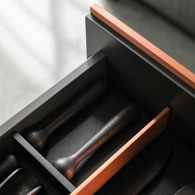 Zacznijmy od szuflad, bo to one w nowoczesnych kuchniach zastępują większość klasycznych szafek. Ale sama szuflada to za mało. Liczy się jej wnętrze:
