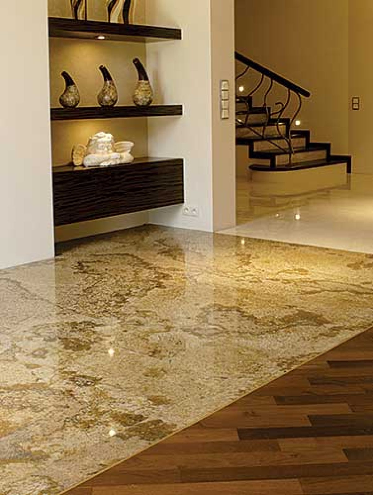 To kamień, który wydobywa się w kopalniach żelaza w Ameryce Południowej. Jest kilkakrotnie twardszy od tradycyjnego granitu i ładnie wygląda w połączeniu ze stalą nierdzewną. Granit i Iron Red są odporne na ścieranie, wysoką temperaturę, zarysowania i uderzenia, idealnie nadają się na posadzki, bo można je myć nawet silnymi detergentami. Ale i w tym przypadku trzeba być uważnym. Wybierając na przykład kamień na stopnie, należy zwrócić uwagę, żeby nie był zbyt śliski. Tadeusz Wysocki poleca modny ostatnio granit o powierzchni szczotkowanej – półmatowej z lekkimi nierównościami, a także powracające do łask łupki i kwarcyty.