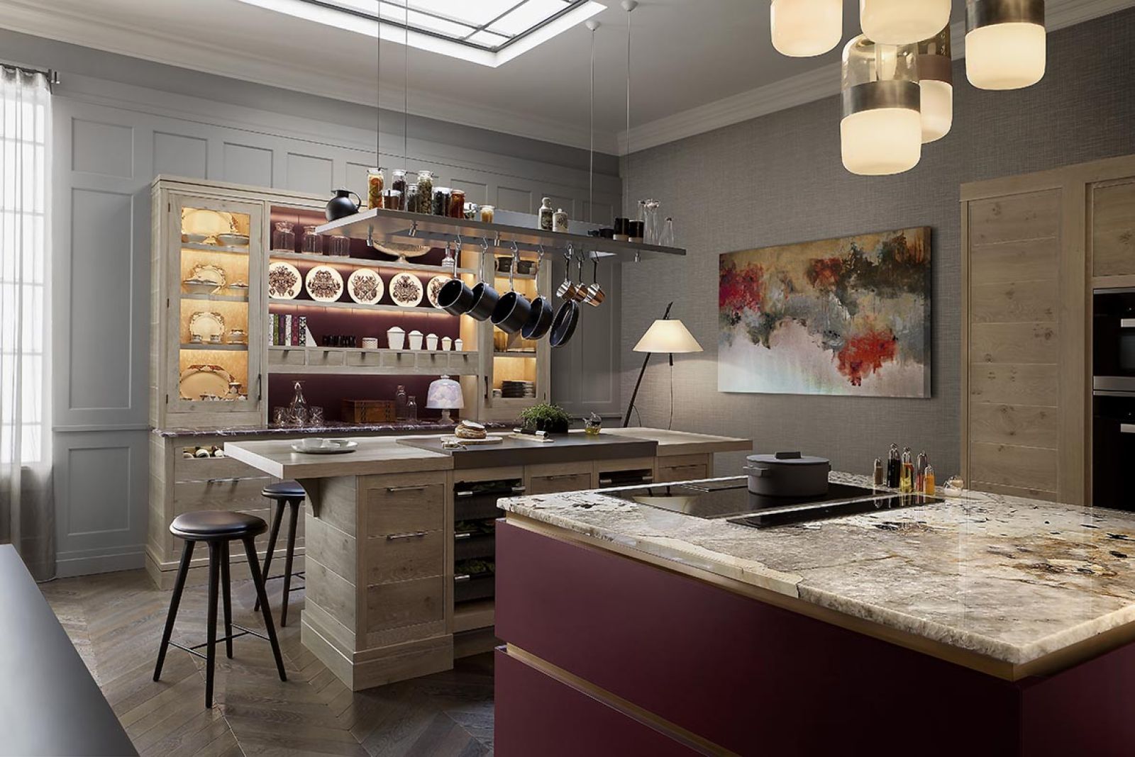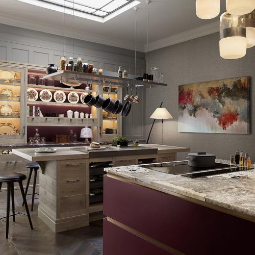 Kuchnia brasserie (z francuskiego „knajpka”, „piwiarnia”) inspirowana kameralnymi lokalnymi restauracyjkami, w których szef kuchni i właściciel w jednej osobie doradza klientom, co mają wybrać. Przychodzą więc całymi rodzinami i przesiadują do późnej nocy, bo tak im dobrze i smacznie, jak w domu. Trudno o lepszy pomysł na kuchnię – nie ma się co dziwić projektantom angielskiej firmy Smallbone. Drewno – lity dąb proszkowany, każdy detal robiony ręcznie. A detali jest tu mnóstwo: półeczki, szafeczki, szufladki, witryny, cokoły, podświetlane szuflady, winiarki. Meble są tak dobrze pomyślane, że nie da się nabałaganić – swoje miejsce ma każda filiżanka (przegródki w szufladach), spodek (wystawki w kredensie), patelnia, rondelek. Wyspa z wieloma szufladami na warzywa, zawieszona nad nią podświetlona półka z hakami na najczęściej używane garnki. Jest nawet miejsce na kolekcję naczyń, książki kucharskie i kilkadziesiąt butelek z winami zarówno leżakującymi, jak i stołowymi. Blaty z czerwonego żyłkowanego marmuru.
