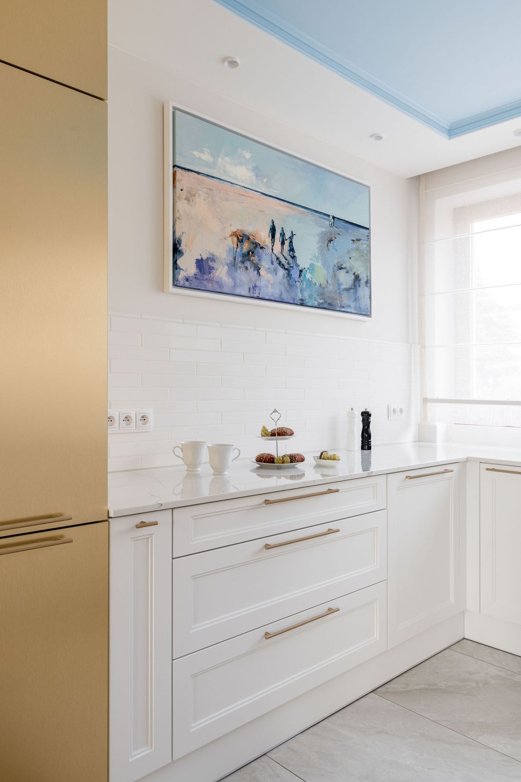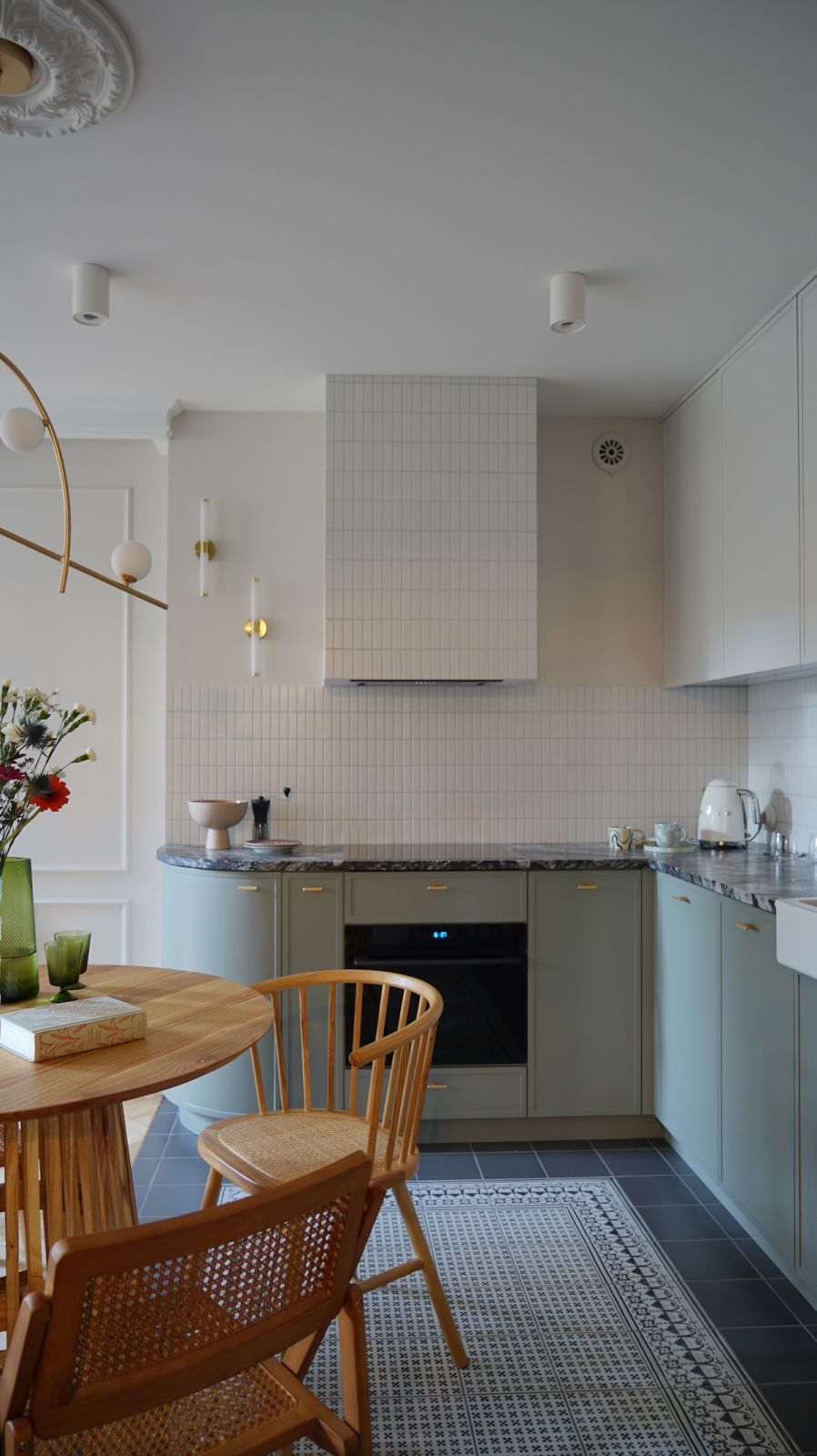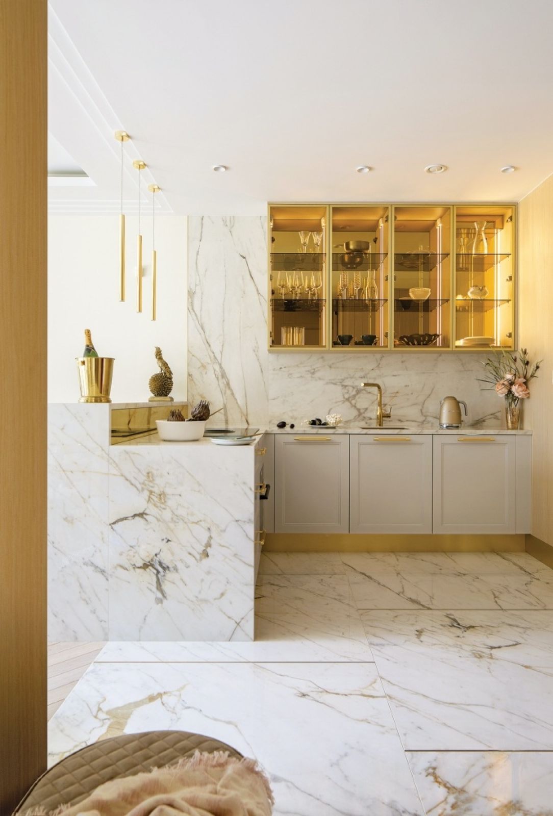 Nie bój się sięgać po kolorowe fronty – szałwiowa, lekko przydymiona zieleń to wciąż numer jeden na naszym rynku. Pamiętaj, żeby ładnie wykończyć widoczne boki szaf – najlepiej materiałem, którym wykończone są blaty lub ściana między szafkami. Może to być piękny marmur, szlachetny fornir, miedziana płyta lub szkliwione płytki.