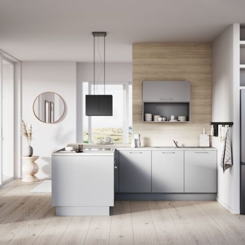 W przypadku dużej kuchni, możesz pokusić się o wzbogacenie zabudowy o wyspę kuchenną. To jak ją ustawisz będzie miało wpływ na to czy domknie ona kuchnię czy wyznaczy granice oddzielającą kuchnię od reszty mieszkania.