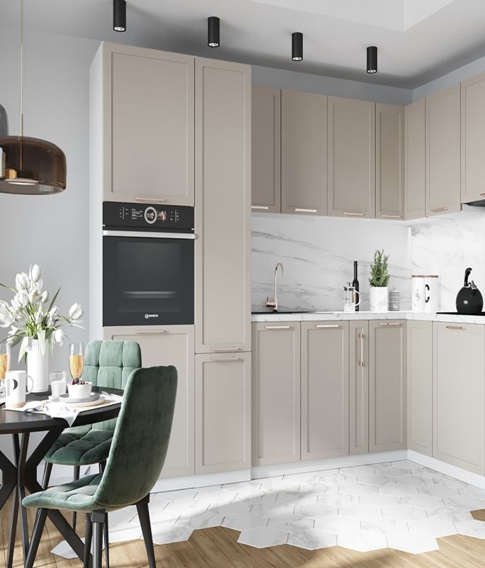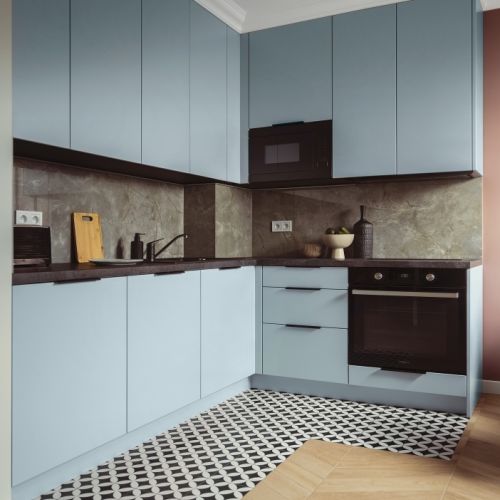 Jak wygląda kuchnia narożna? Szafki kuchenne rozmieszczone na dwóch sąsiadujących ze sobą ścianach – najczęściej dłuższej i krótszej, tworzą kąt 90 stopni, czyli kształt litery L.