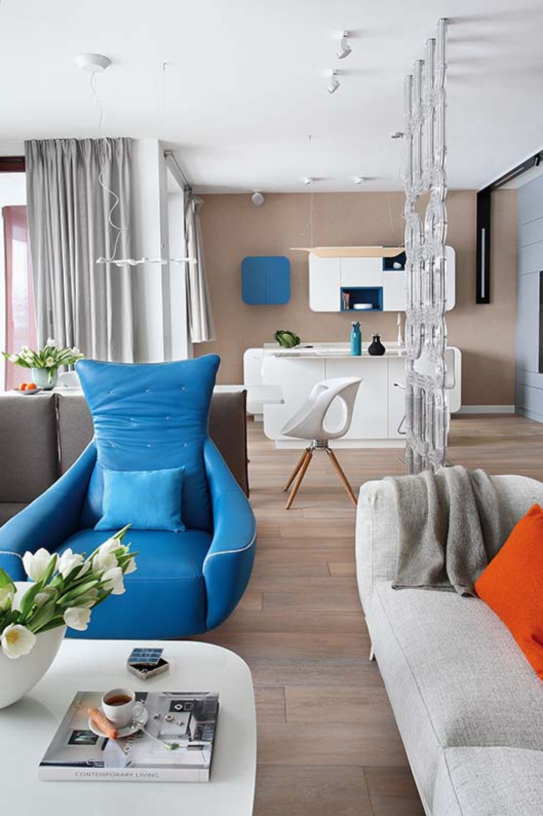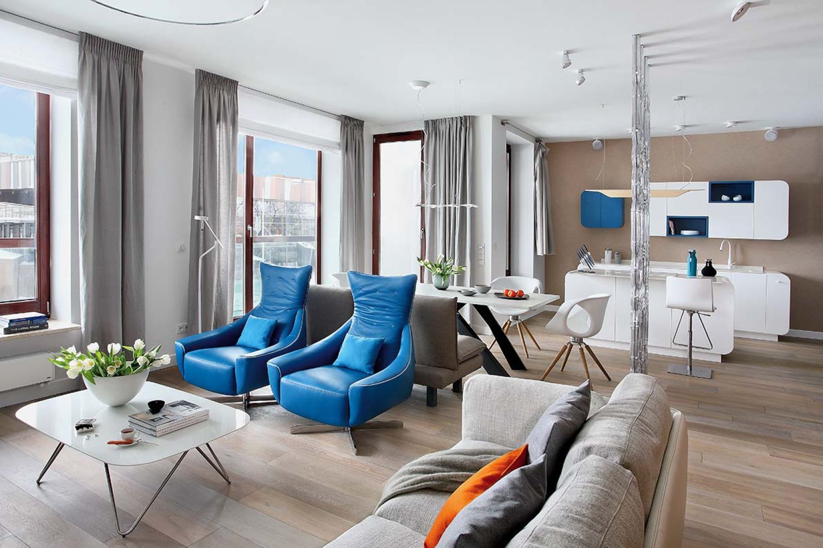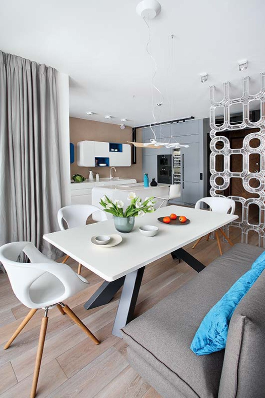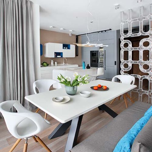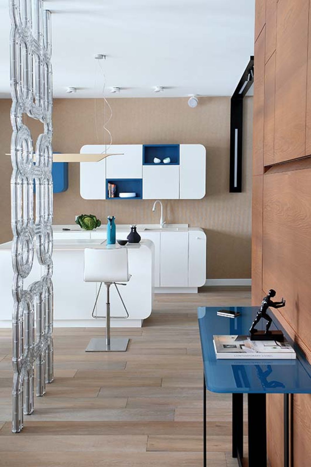 Jedną z pierwszych rzeczy, którą zobaczyła architektka Katarzyna Koszałka, wchodząc do tego apartamentu, był widok – pasek nieba i pasek wody plus trochę zieleni. Wszystkie okna wychodziły na Wisłę. Niezwykły obraz podsunął jej pomysł. Kuchnia otwarta na salon jest nowoczesna, bo nowoczesne są budynek i okolica (obok stoi Centrum Nauki Kopernik). Na podłogi, jak w całym apartamencie, pasowało więc szczotkowane i olejowane drewno (nawiązujące do drzew za oknem). Postanowiła dodać odrobinę błękitu w półkach i dodatkach (to nawiązanie do wody). Zdecydowała się też na modne obłości (zachwyciła się nimi na targach dizajnu w Mediolanie), tak jak obłe bywają fale.