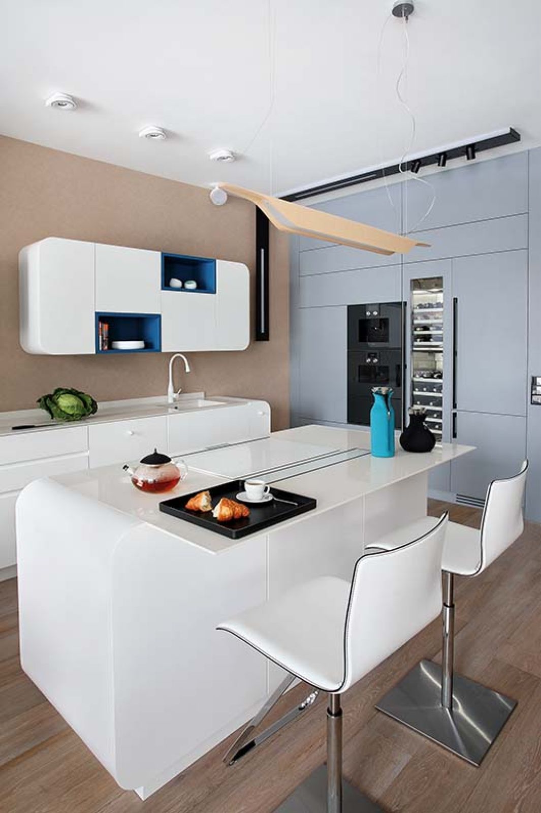 Niebieski to nawiązanie do rzeki za oknem, obłe kształty mają przypominać fale. Wyszło futurystycznie i miło dla oka.