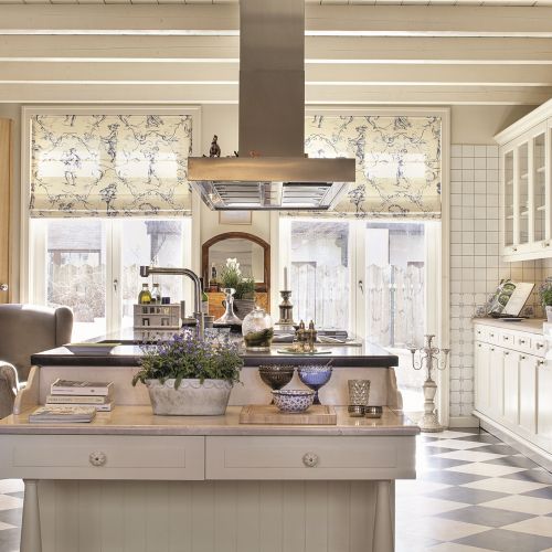 W stylu rustyklanym królują naturalne materiały: drewno, kamień, len, bawełna. O klimat kuchni pomogą zadbać dodatki z duszą: wzorzyste rolety, kolorowe zasłony, lniane serwety i obrusy, wikilnowe kosze, miedziane rondle, drewniane deski do krojenia, emaliowane naczynia, ręcznie malowana ceramika. Dobrze wyglądają wszelkie motywy folkowe. Znajdzie się też miejsce na misy pełne owoców, bukiety polych kwiatów oraz świeże zioła.