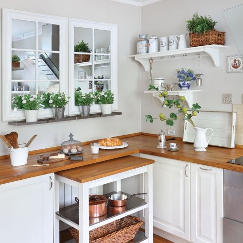 Jeśli chcemy zadziałać jednym, ale solidnym akcentem, pomyślmy o wyspie kuchennej zbudowanej z drewna. Ciepły nastrój do wnętrza wprowadzą deski pomalowane na biało, beżowo, szaro lub w modnym odcieniu gołębiego błękitu. Prostota rustykalnej kuchni z wyspą zbiega się świetnie z funkcjonalnością. Powieszone nad kuchnią zioła zdecydowanie podkreślą sielski charakter wnętrza.