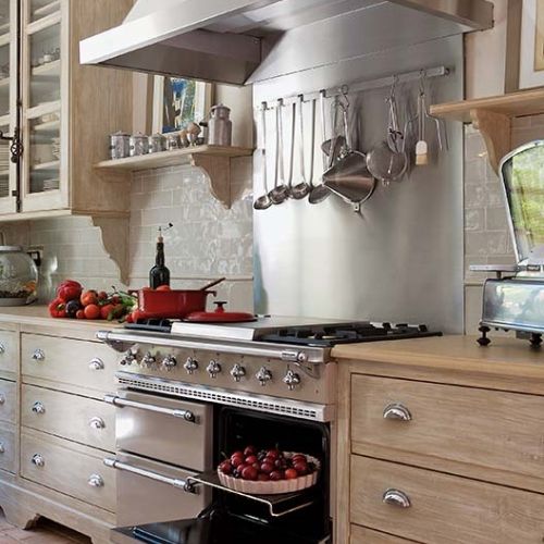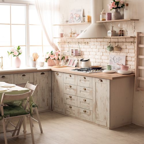 Meble kuchenne w tym stylu pięknie wyglądają w naturalnym kolorze drewna. W rustykalnej aranżacji sprawdzą się również białe szafki kuchenne oraz te w jasnych odcieniach: beżach, szarościach, a nawet błękitach i zieleniach. Przeszklone witryny, kredensy i proste półki, na których wyeskponujemy naczynia, szkło i ceramikę świetnie podkreślą rustykalny charakter kuchni.