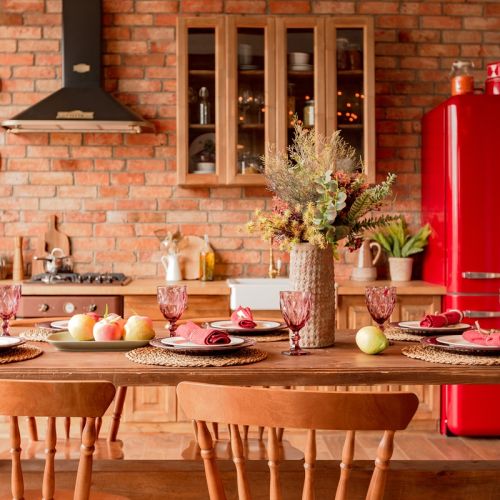 Sercem kuchni, ale już w szczególności kuchni rustykalnej, jest stół. Dopasujmy go do całej aranżacji. Być może okaże się, że świetnie sprawdzi się mebel kupiony na pchlim targu, który przeniesie biesiadników w dawne czasy. Na krzesłach połóżmy wygodne poduszki. We wnętrzach w stylu rustykalnym sprawdzi się też solidna, drewniana ława postawiona obok stołu.