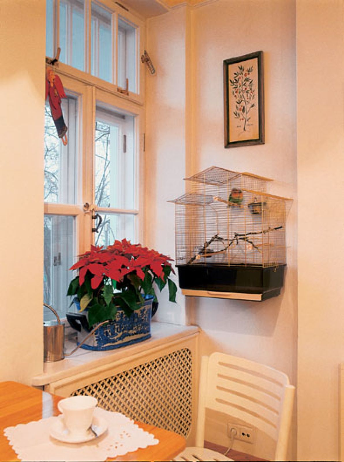 Znajomą artystkę, Anię Pabisiak, poprosiła o namalowanie pod sufitem kwiatowego ornamentu. Inspiracją były ryciny – czerwone kwiaty jak z dawnego zielnika. Podobne Ania wymalowała na ścianach, wplatając pomiędzy nie imiona domowników. Czerwone kwiaty pojawiają się też na zasłonach. Pani Małgorzacie udało się dobrać jeszcze radio w stylu retro w tym samym kolorze.
