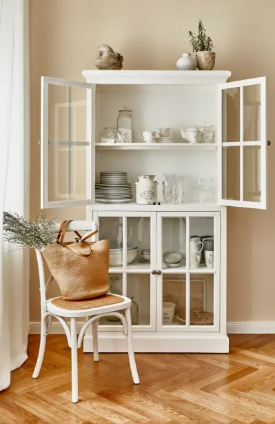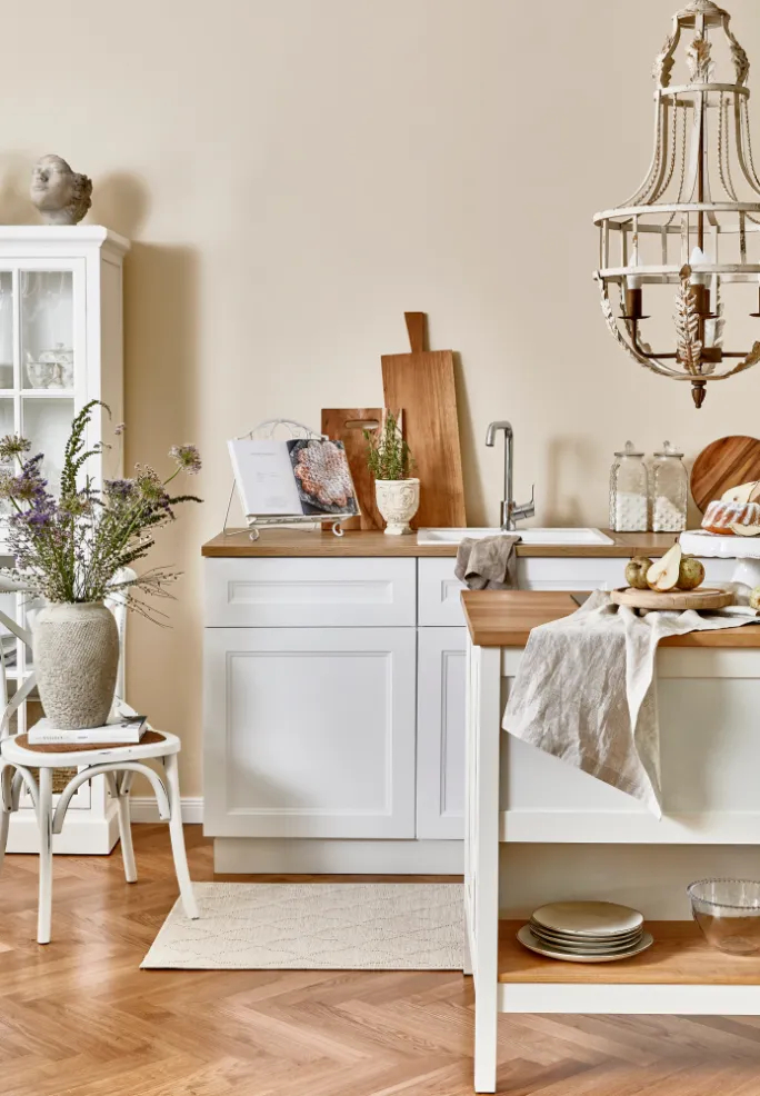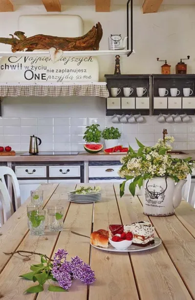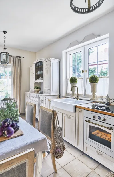 W prowansalskiej kuchni nie może zabraknąć drewnianych, malowanych na biało lub kremowo mebli. Wybieramy te proste, ale stylowo zdobione, celowo postarzane lub na wygiętych nóżkach. Fronty szafek często są ażurowe, z otworami lub wyciętymi pojedynczymi elementami. Zamiast drzwiczek możemy zastosować materiałowe zasłonki.