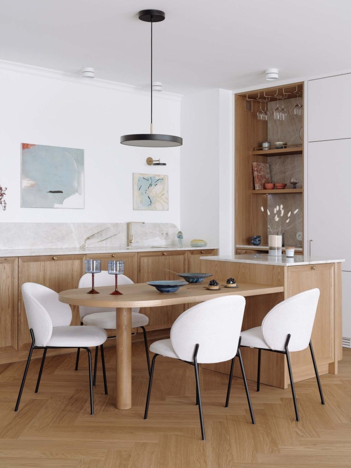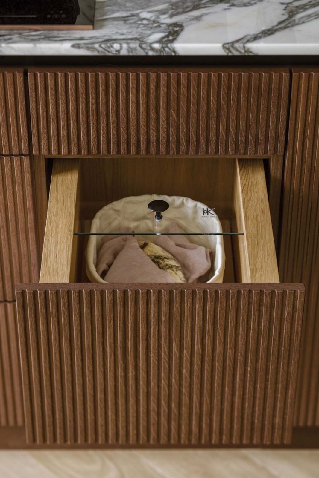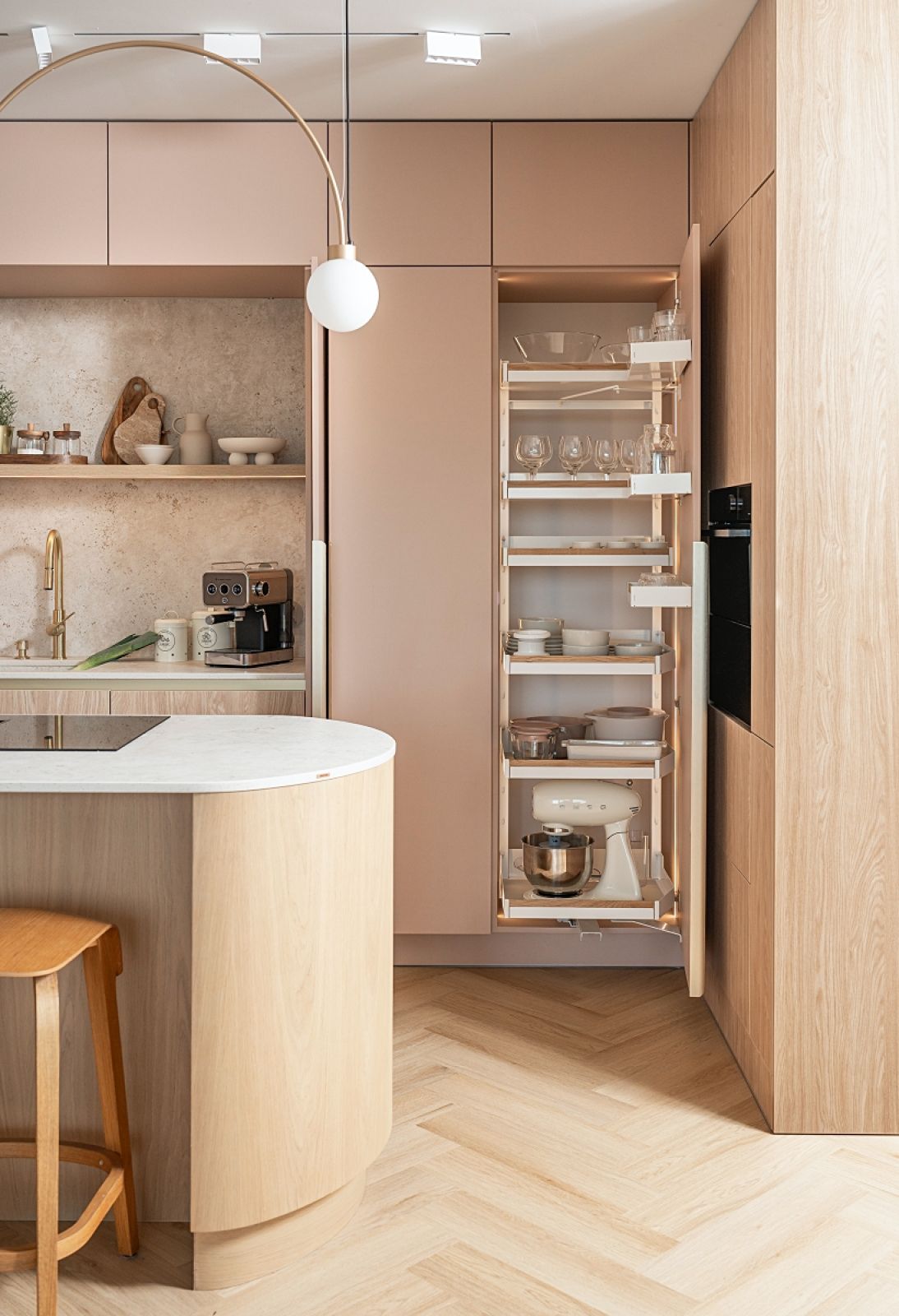 Coraz większą wagę przykłada się do tego, co widać na pierwszy rzut oka, i do tego, co pozostaje ukryte. Kuchnie projektowane są dwuwarstwowo: reprezentacyjna część pozostaje czysta i spokojna, a intensywna praca przenosi się na zaplecze: do spiżarni czy dyskretnie schowanych stref. Mniej jest drobnych podziałów i ozdobników, więcej dużych, dobrze przemyślanych płaszczyzn. To kuchnie, które nie próbują być „na czasie”, tylko są po prostu dobrze zaprojektowane – wyjaśnia Magdalena Kostrzewa-Świątek z pracowni Tissu Architecture.