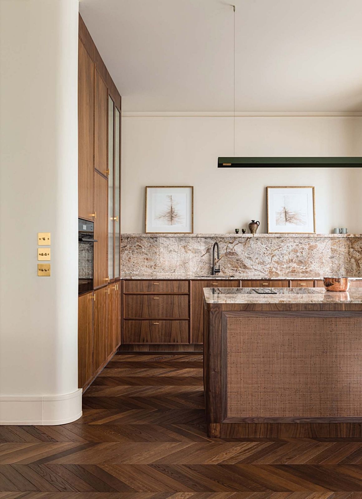 Niezmiennie w modzie jest kamień. Szczególnie ceniony jest ten z wyraźnym użyłowaniem, które stanowi naturalny element dekoracyjny. To tak zwany statement stone, który przyciąga wzrok i porządkuje całą aranżację. Coraz częściej kamień pojawia się również na ścianach, np. jako cokół lub okładzina w strefie gotowania.