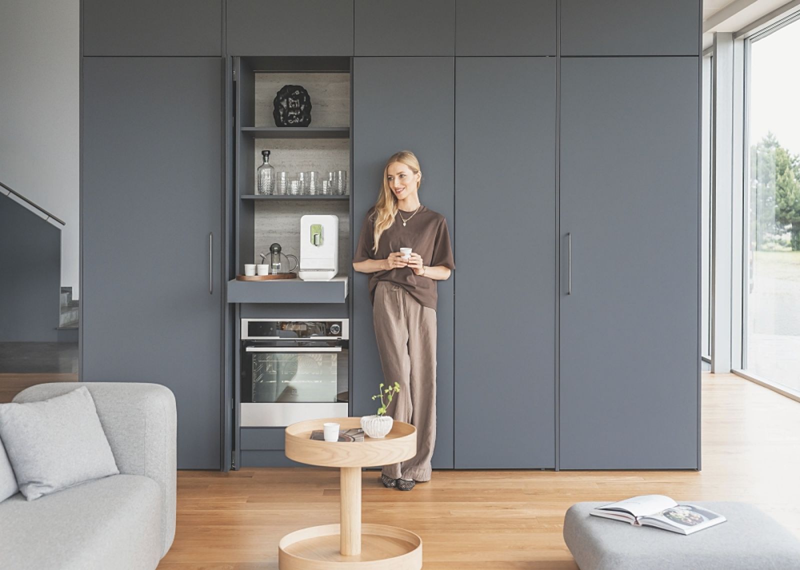 Ekspres, młynek, kapsułki lub ziarna, filiżanki – wszystko to mieści się w dedykowanym miejscu, w którym urządzamy kącik do parzenia kawy. Często z dodatkową małą lodówką na mleko bądź śmietankę.