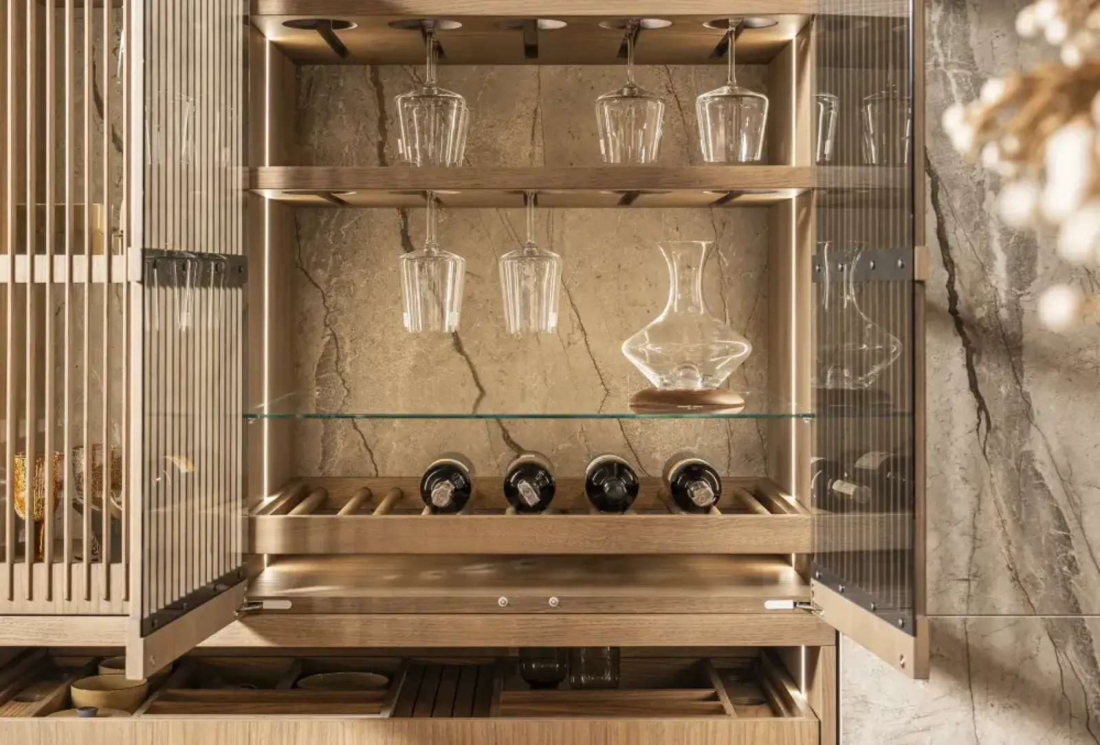 Meble wolnostojące coraz częściej pojawiają się w przestrzeni kuchni. To elementy przeniesione z salonu wprost do strefy kulinarnej, które łagodzą jej charakter i dodają przytulności. Witryny i przeszklone szafki nie tylko nadają wnętrzu lekkości, ale są także idealnymi miejscami na wyeksponowanie ulubionych dekoracji.