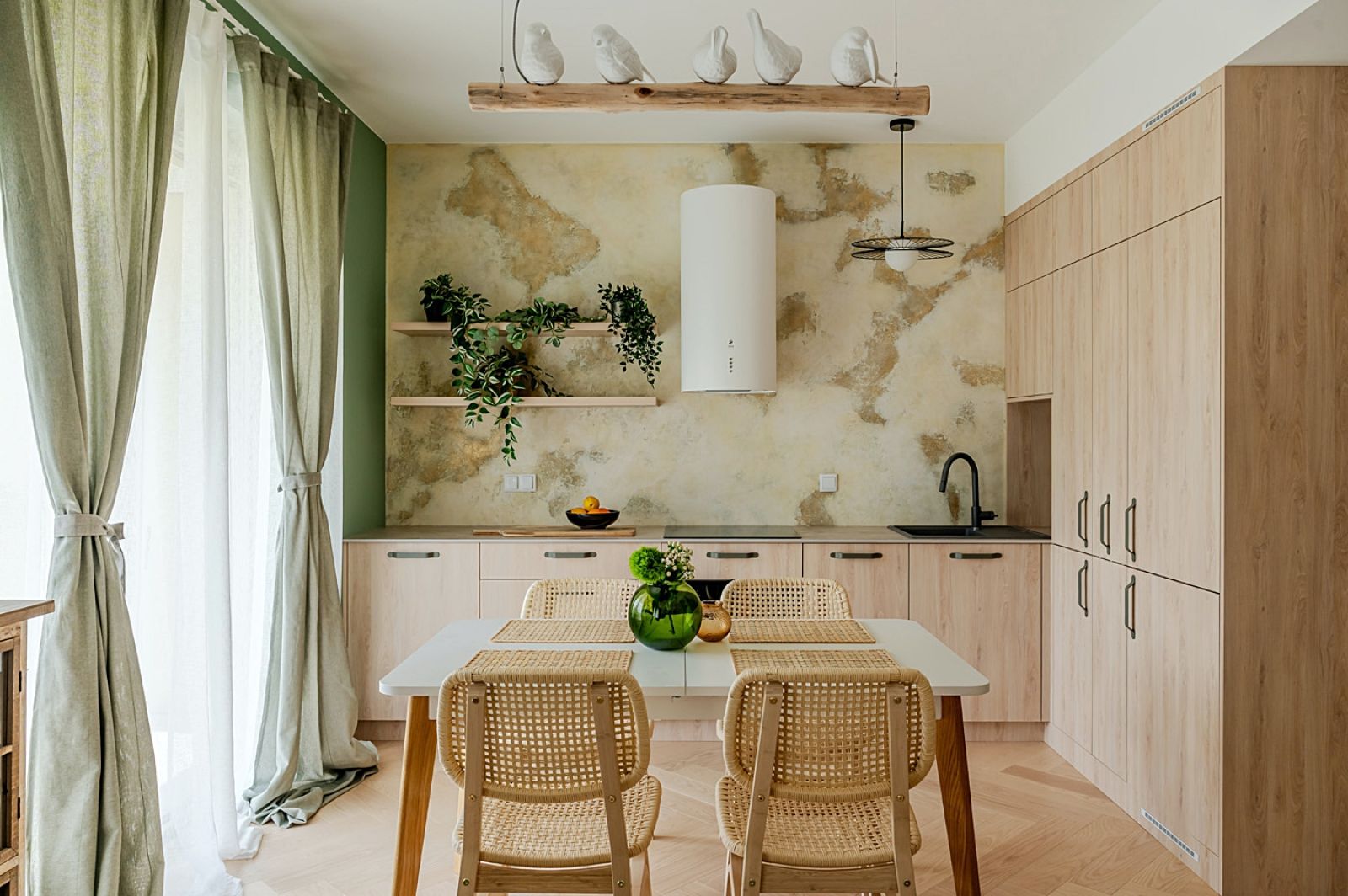 Szczególnie modne są kolekcje eksponowane na otwartych półkach. Kolorowe filiżanki, książki kucharskie, pamiątki z podróży, ceramiczne pojemniki na przyprawy, talerze vintage – tych przedmiotów nie chowamy. Niech opowiadają naszą historię. W podobnym duchu funkcjonują obrazy na ścianach i kolorowe tapety – elementy, które dotąd były zarezerwowane dla salonu, dziś goszczą także w kuchni.