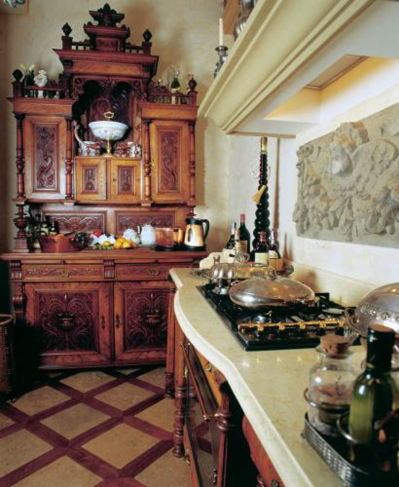 Płyta grzejna i piekarnik są oczywiście w stylu retro. Wbudowano je w kamienny blat i szafki stylizowane na stare komody. Z kolei zlew, podobnie jak armatura, wykonany jest z miedzi młotkowanej w piasku. Okap wykończony gzymsem z piaskowca też prezentuje się bardzo stylowo. Ale najbardziej niezwykłą ozdobą tej części kuchni jest płaskorzeźba na ścianie – to fragment portalu ocalony z rozbieranej starej kamienicy.