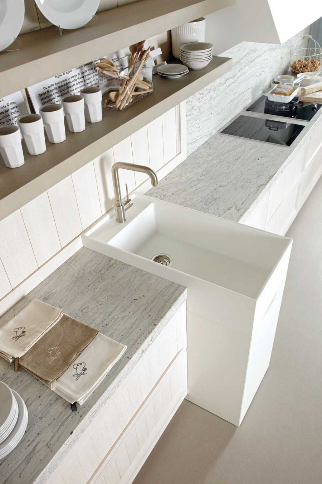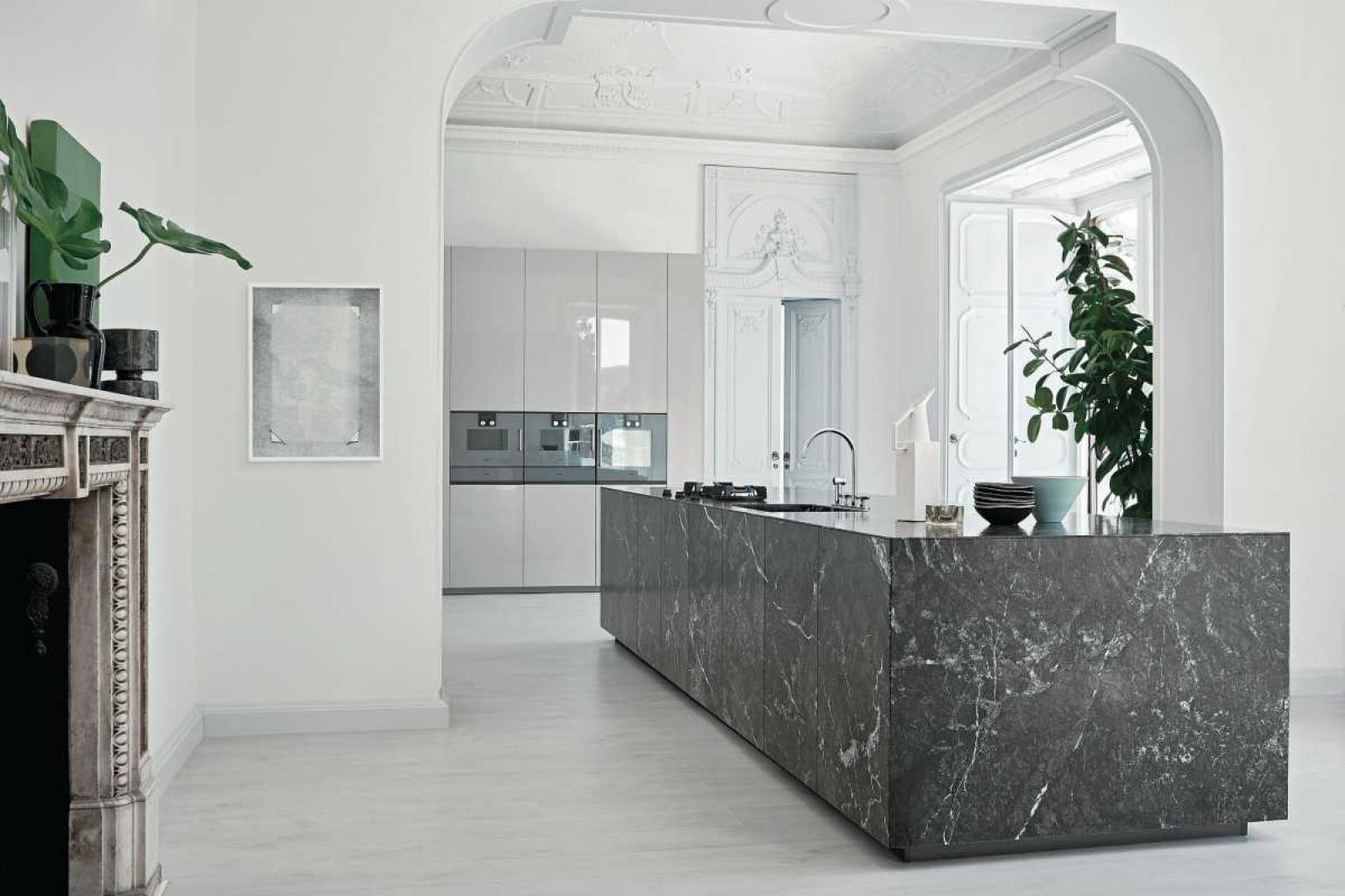 Kiedyś robiono z niego blaty i podłogi. Teraz nawet fronty szafek i całe wyspy kuchenne, jak ta włoskiej marki Cesar. Aby nowoczesna kuchnia nie przypominała grobowca z sarkofagiem na środku, pozostałe meble są w jasnym, lekko szarym kolorze. Zjawiskowo wyglądają okładziny marki Kreoo zdobione wstawkami ze szkła z Murano, kryształów albo półszlachetnych kamieni.