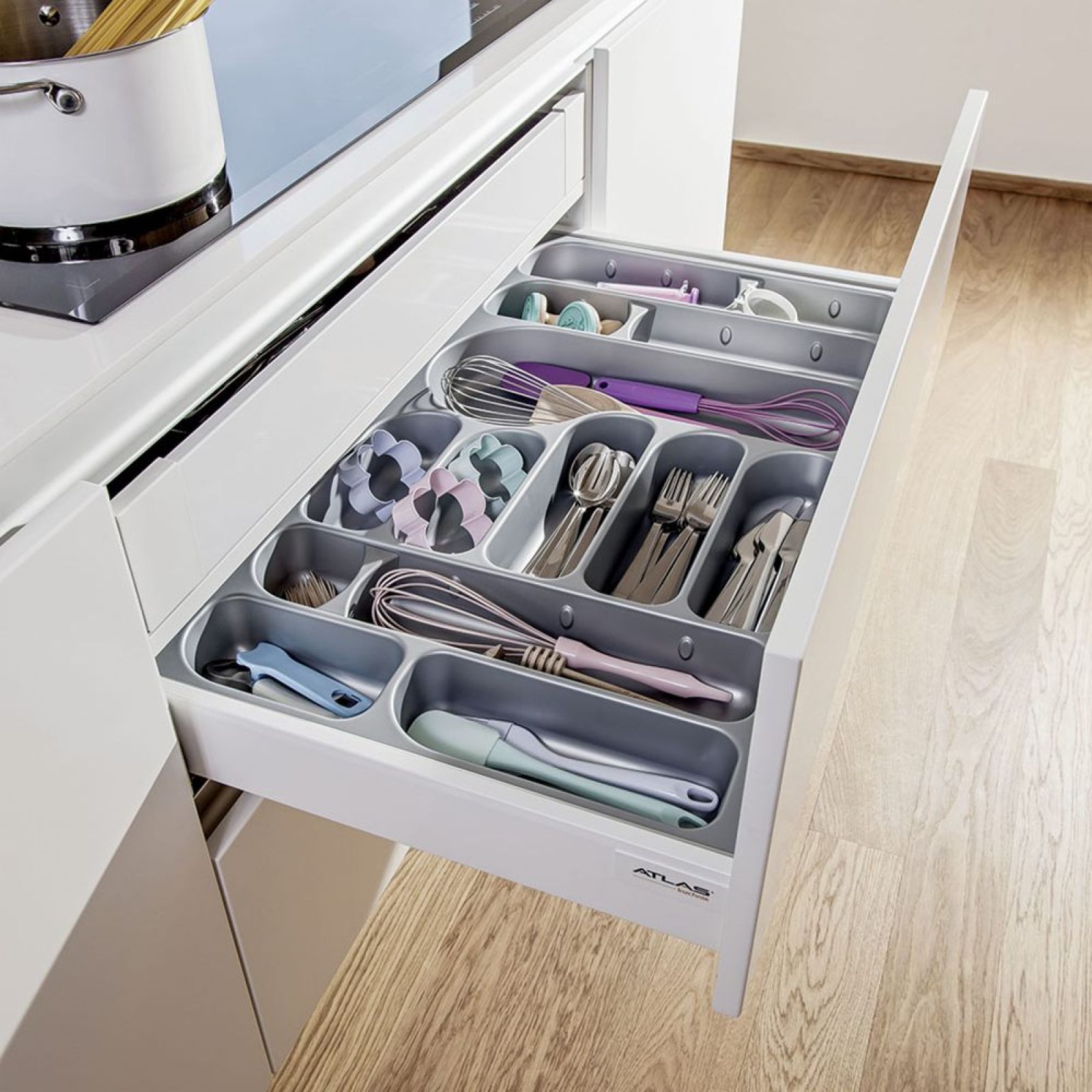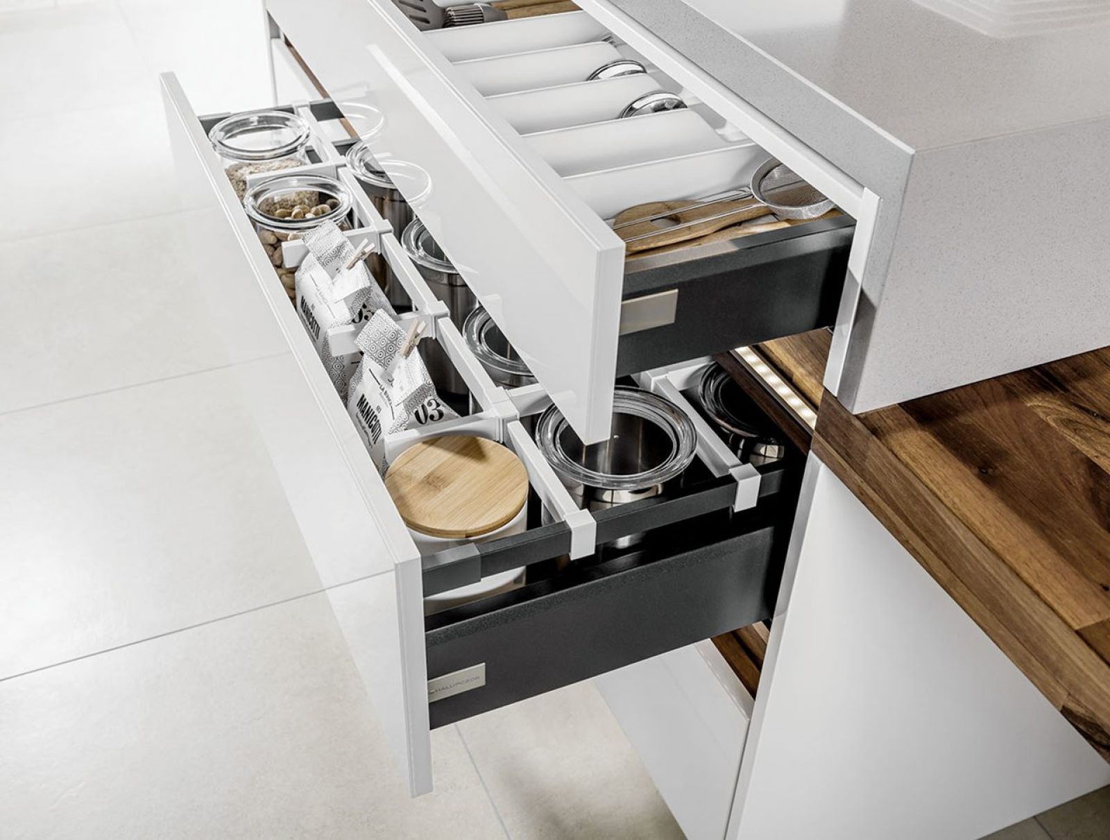 Z naukową precyzją w specjalnie zaprojektowanych szufladach układamy kuchenne akcesoria. Pomogą nam w tym przegródki na garnki, sztućce, trzepaczki, tarki i tareczki... W cargo z siatkowymi koszami ustawiamy kasze, makarony i ryż. Gdy są potrzebne, od razu widać, co gdzie jest.