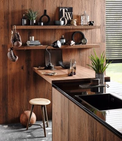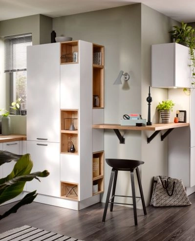 Regał Thema to wszechstronny mebel, który może służyć zarówno jako stylowy barek kawowy z wysuwaną półką, jak i jako stanowisko pracy do codziennego użytku. Wygląda prawie jak oddzielne pomieszczenie w kuchni. Możemy go dowolnie łączyć z meblami niemieckiego producenta, dbając o spójny wystrój pomieszczenia.