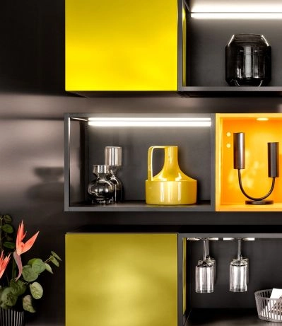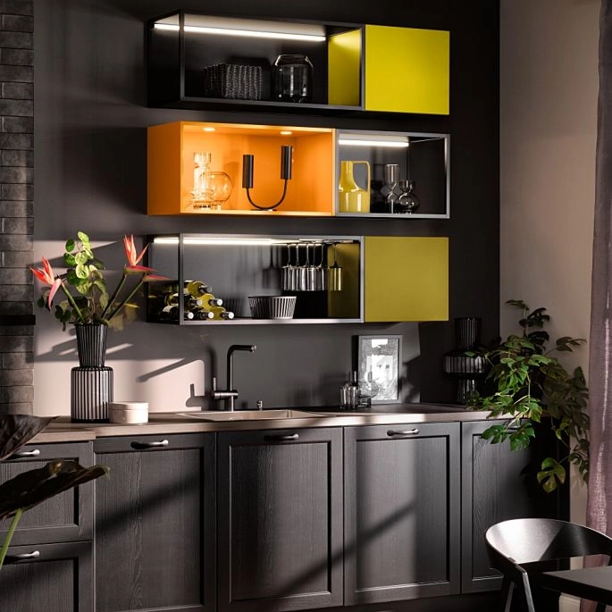 Dzięki przemyślanej kolorystce mebli uzyskamy doskonałe efekty. Możemy idealnie dopasować odcień regału (dowolny dobór z 190 barw palety RAL) do koloru zabudowy lub efektownie skontrastować go z szafkami kuchennymi, by zaakcentować np. designerski wazon czy piękną kolekcję porcelany i skierować na nie wzrok naszych gości.