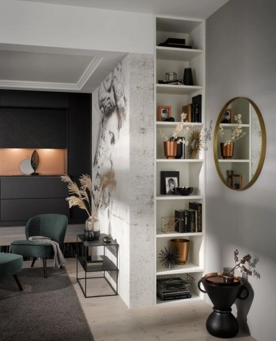 Dzięki regałom pomieszczenia są otwarte i bardziej zróżnicowane. Nasi goście mają wiele do odkrycia – czy to włoskie wazony, porcelanowe filiżanki, kolorową ceramikę czy całą kolekcję kryształowych kieliszków. Nawet najzwyklejszy regał stanie się intrygujący, gdy z pomysłem ułożymy na nim dekoracyjne drobiazgi. My zaś poczujemy się lepiej wiedząc, że wszystkie rzeczy, które są dla nas ważne, mają elegancką oprawę.