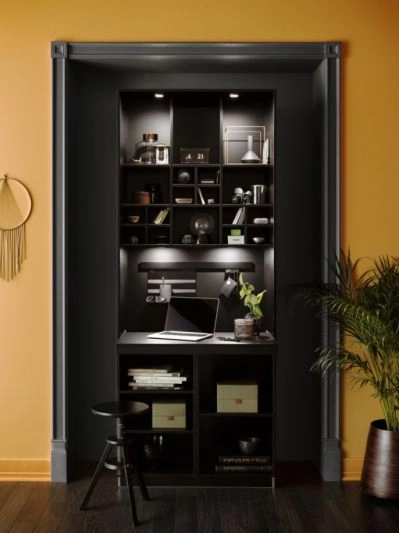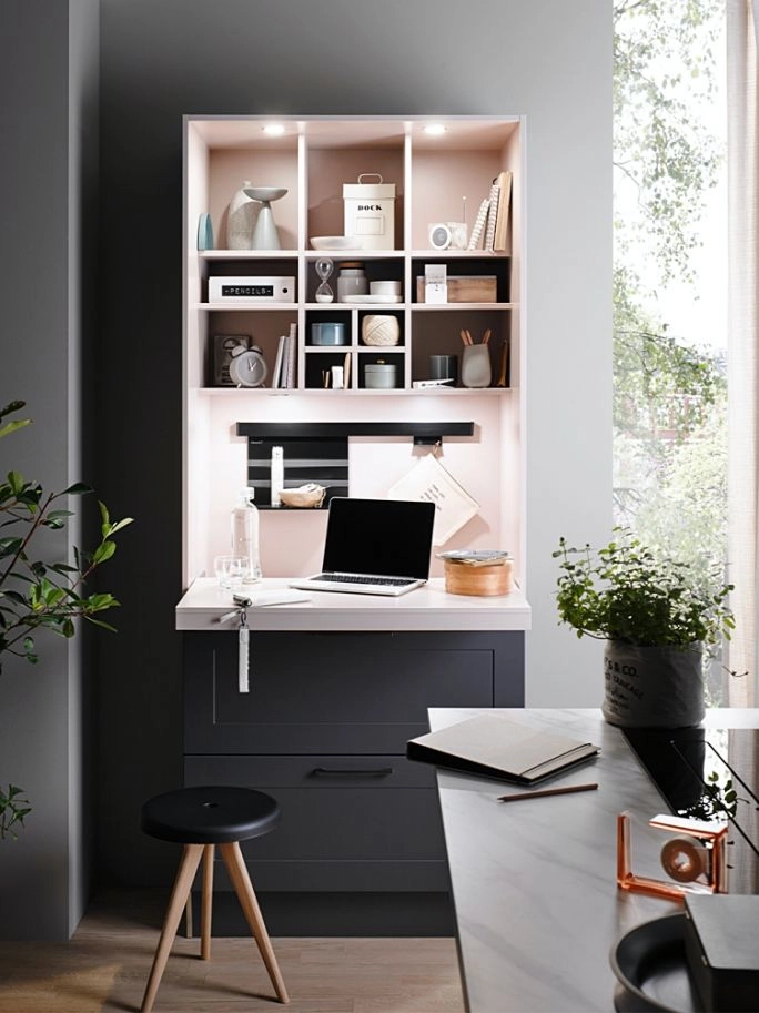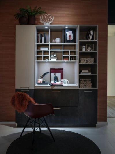 Zmiana trybu pracy wpłynęła na aranżację wnętrza. Przestrzeń naszego mieszkania zaczęła pełnić nową, dodatkową funkcję – home office. A my zaczęliśmy się zastanawiać, gdzie urządzić kącik biurowy, aby był wygodny, funkcjonalny oraz przytulny. Dzięki rozwiązaniom marki Häcker, takim jak regał Thema, domowe biuro możemy urządzić w kuchni.