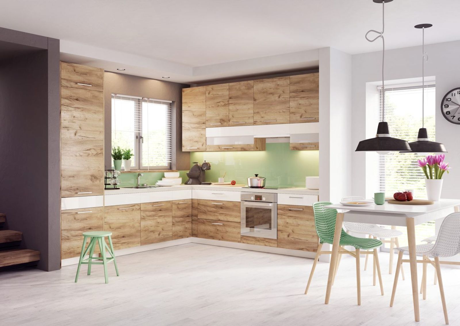 Podobnie jak na podłodze, frontach mebli i blatach kuchennych również na ścianie można zastosować drewno czy dekory inspirowane jego rysunkiem. Kolor i wzór drewna na ścianie idealnie skomponowany z całością zabudowy lub jej pojedynczymi elementami (blat, korpusy szafek, cokoły) wprowadzi do kuchni wrażenie ładu i harmonii. Aranżacja kuchni z drewnem nad blatem ociepli wnętrze, nada mu przytulności i ponadczasowego piękna. Dzięki nowoczesnym technologiom produkcji materiałów drewnopochodnych i laminatów naśladujących drewno są one odporne na zabrudzenie, krople wody czy tłuszcz, dlatego bez obaw można pokryć nimi ściany nad blatem, kuchenką czy zlewozmywakiem.