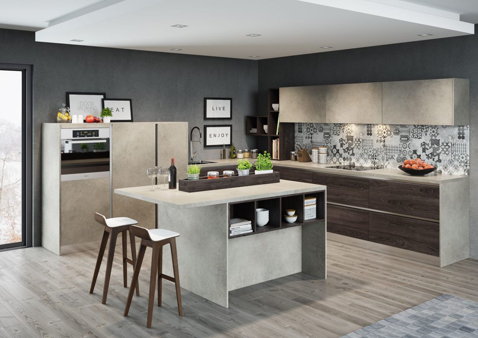 W nowoczesnej kuchni nie może zabraknąć szlachetnych kamieni. Dekory inspirowane naturalnym kamieniem są ciepłe w dotyku i doskonale komponują się zarówno z jednobarwnymi frontami w wysokim połysk, jak i wzorami drewnopodobnymi. Idealnym dla nich miejscem są nie tylko blaty, ale również korpusy szafek czy właśnie ściana tuż nad blatem. Prestiżowy dekor inspirowany rysunkiem marmuru to propozycja zarówno do wnętrz utrzymanych w stylu industrialnym, jak i bardziej stylowych. Dekor kamienny, którym wykończony jest blat łączący się płynnie z dekorem na ścianie, to nie tylko sposób na stworzenie spójnej, harmonijnej aranżacji, ale wprowadzenie szczypty luksusu do każdego wnętrza.