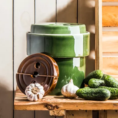 Szklane słoje i naczynia z kamionki przydadzą się na kiszoną kapustę, ogórki, zakwas na żur. W kamionce kisi się najzdrowiej – naturalne glinki nie wchodzą w żadne reakcje z żywnością. Kamionkowe beczki do kiszenia ogórków i kapusty ładnie się prezentują, świetnie wyglądają w rustykalnych kuchniach.