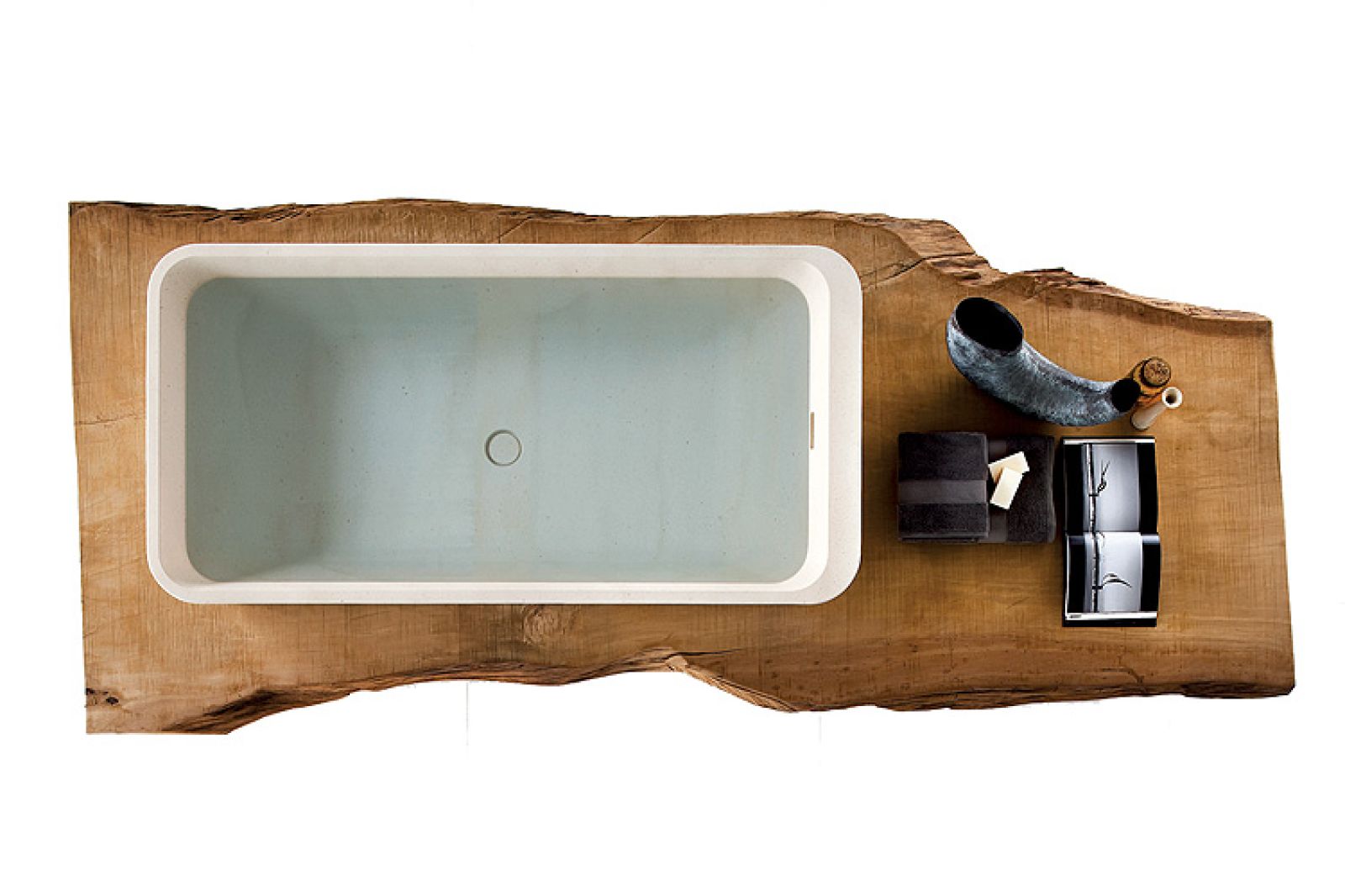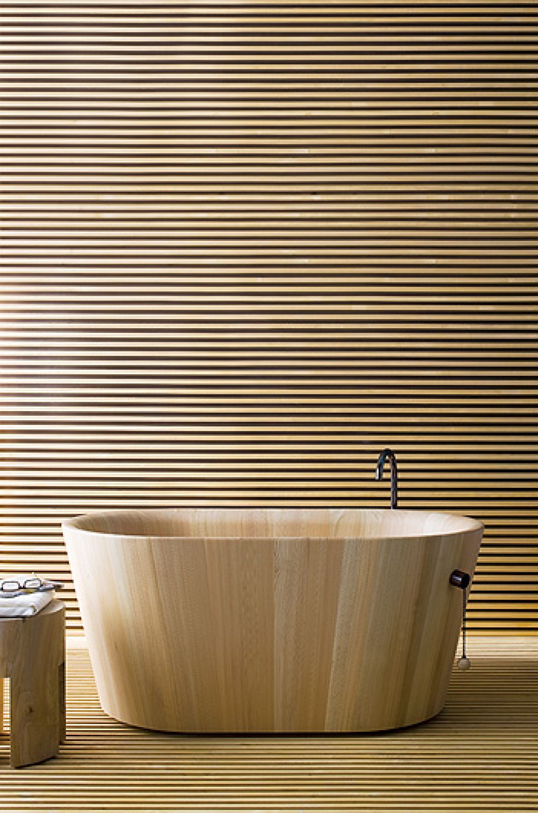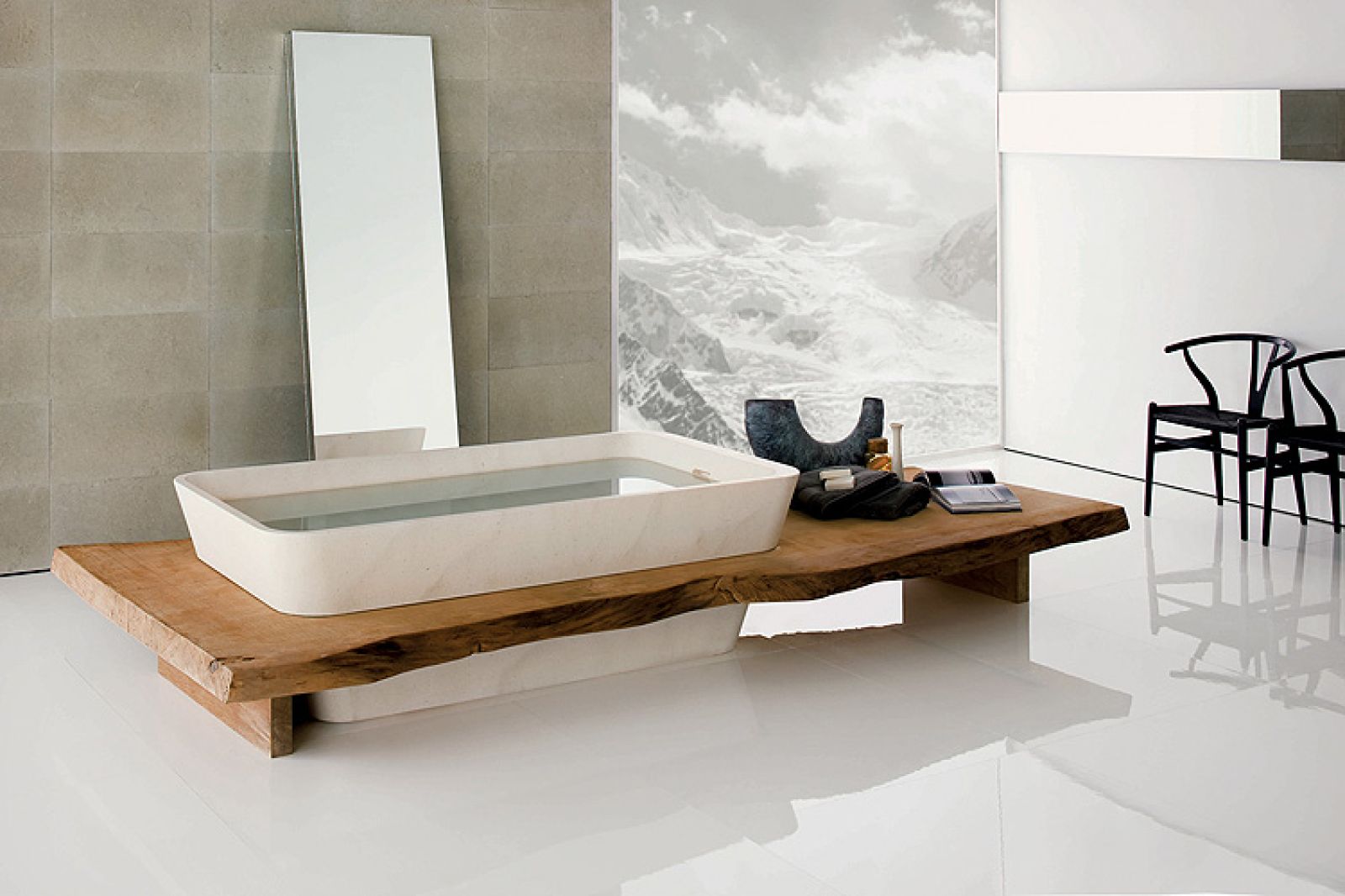 Uwielbia to, co naturalne, co łagodnie przechodzi w otaczający krajobraz i jest przyjemne w dotyku, czyli drewno i kamień (zwłaszcza biały). W słynnej kolekcji dla Neutry kamienną owalną wannę i umywalki z kolekcji Duo ustawił na blacie z rzadkiego drewna kauri. – Ale najbardziej cenię modrzew, jego drewno jest lekkie i trwałe – podkreśla.
