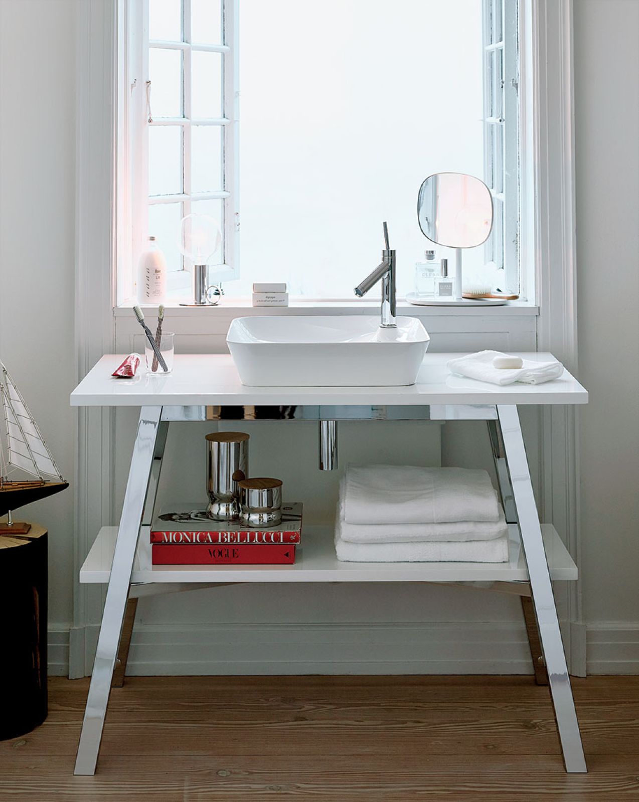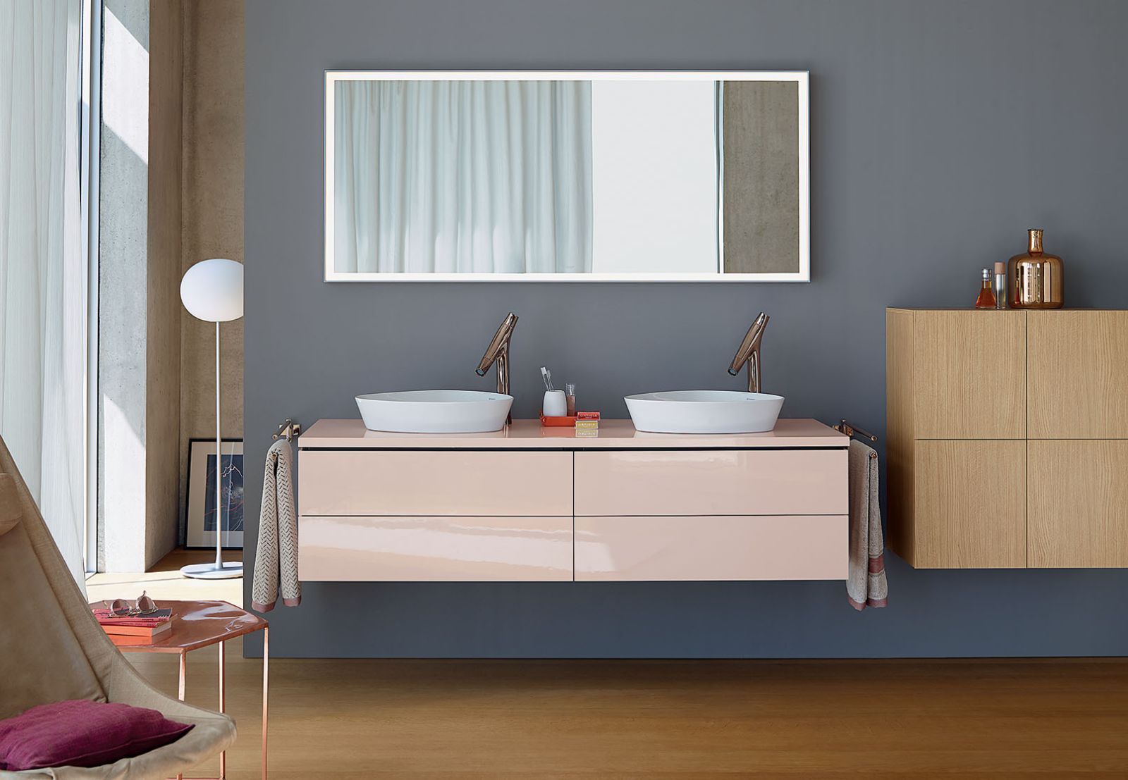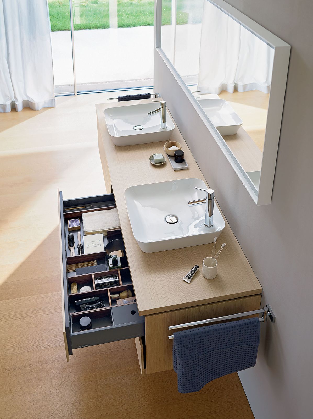 z której można zrobić umywalki o bardzo cienkich ściankach, a baterie wstawić do środka! Do swojego dzieła Starck dołożył jeszcze stolik na błyszczących, ukośnie ustawionych nogach. Jeśli szukamy bardziej klasycznych mebli z wygodnie zasuwającymi się szufladami i mnóstwem przegródek, warto przyjrzeć się kolekcji L-Cube. Stworzył ją Christian Werner. Projektant umiejętnie zmiksował formy prostokątne i kwadratowe, matowe i z połyskiem. Do wyboru mamy też różne kolory MDF-u i forniru.