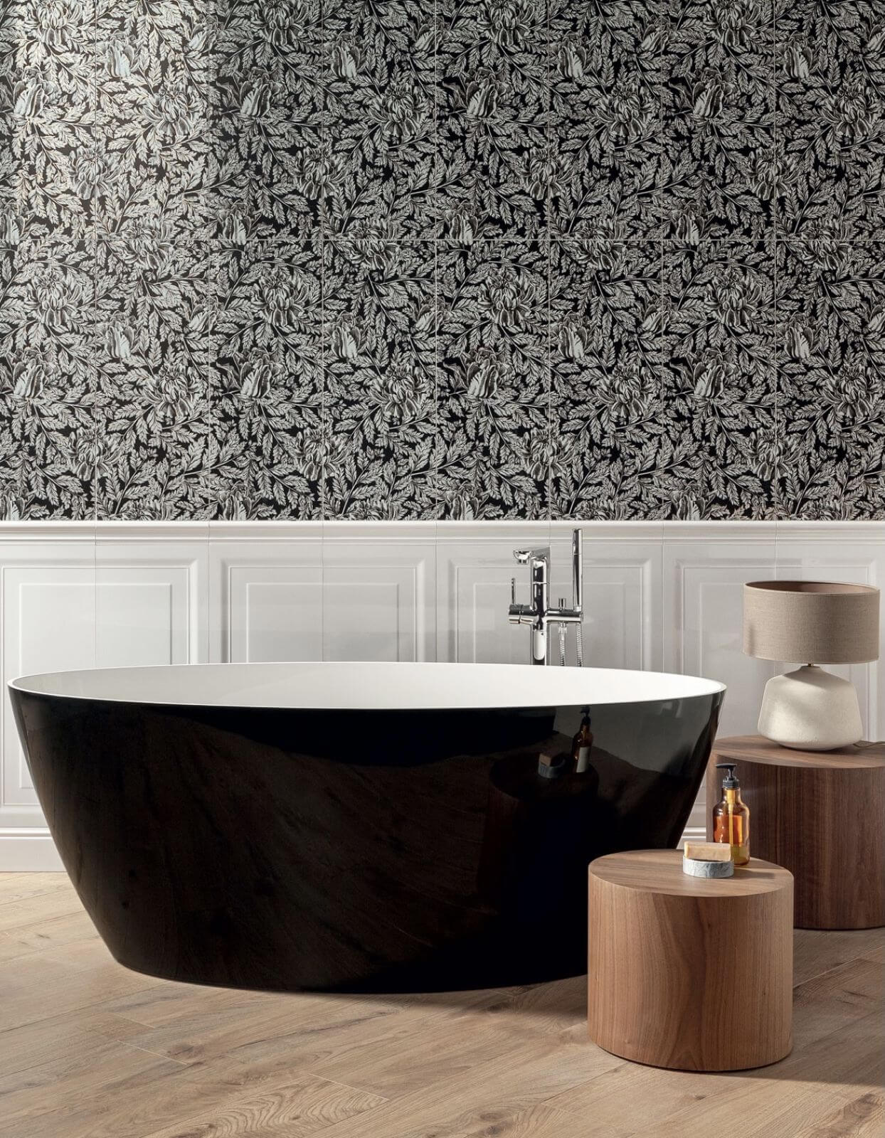 W łazience modern organic sprawdzą się również płytki imitujące kamień. Możemy połączyć ze sobą kilka kolekcji – ciekawie prezentują się gładkie płyty z delikatnymi żyłkami z dekorem o ryflowanej fakturze. Szyku dodadzą im wolnostojące wanna i umywalka z czarnego marmuru, dywan i tapicerowany puf – luksusowa łazienka w stylu modern organic coraz bardziej upodobnia się do... salonu.