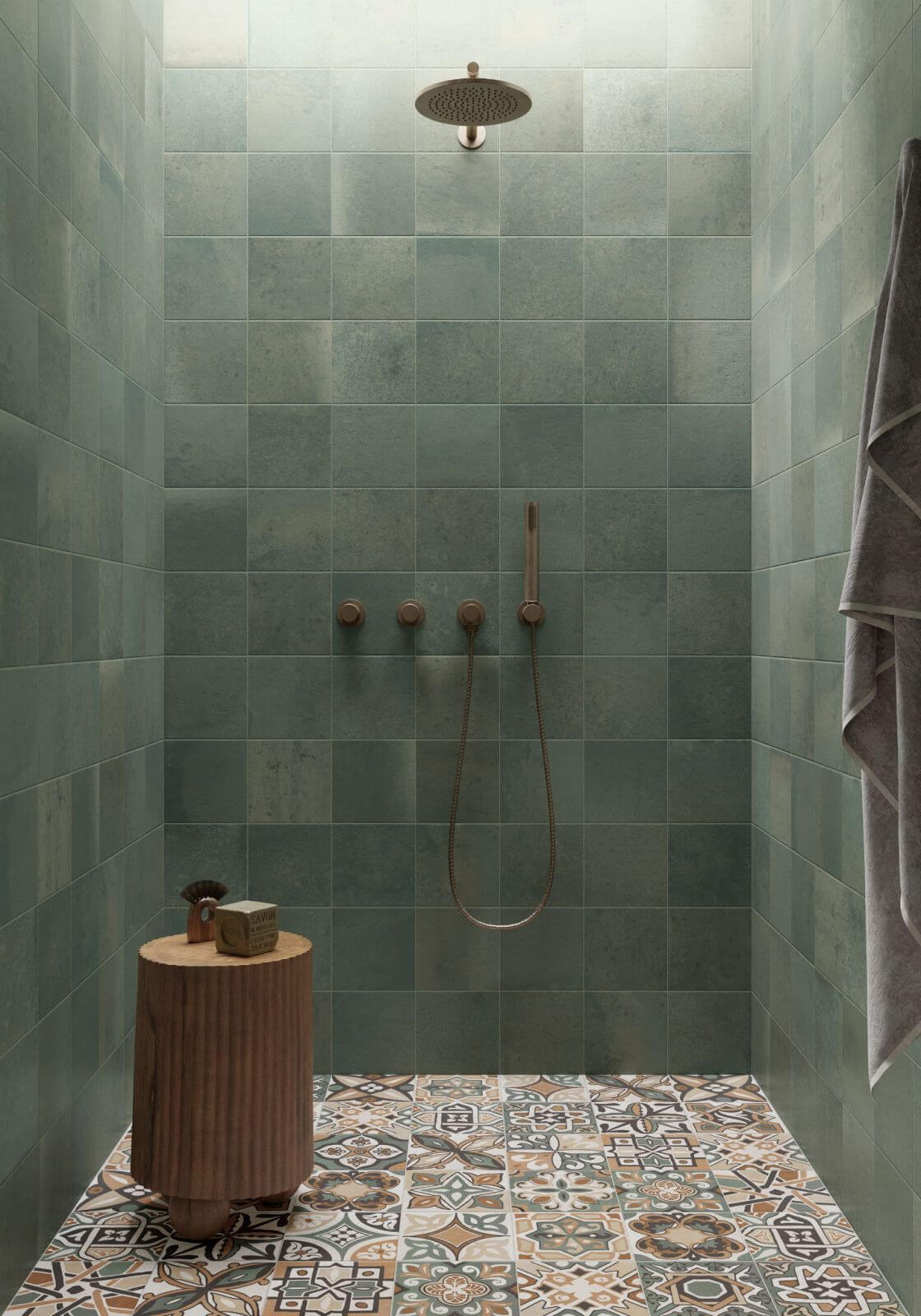 W łazience modern organic najczęściej zazieleniają się ściany. Płytki? Kwadraty 10 x 15 cm lub prostokąty wielkości popularnych cegiełek, ale uwaga: kładzione pionowo – to teraz hit w dekoracji ścian. Rzadziej pojawiają się większe formaty typu 30 x 30 cm.