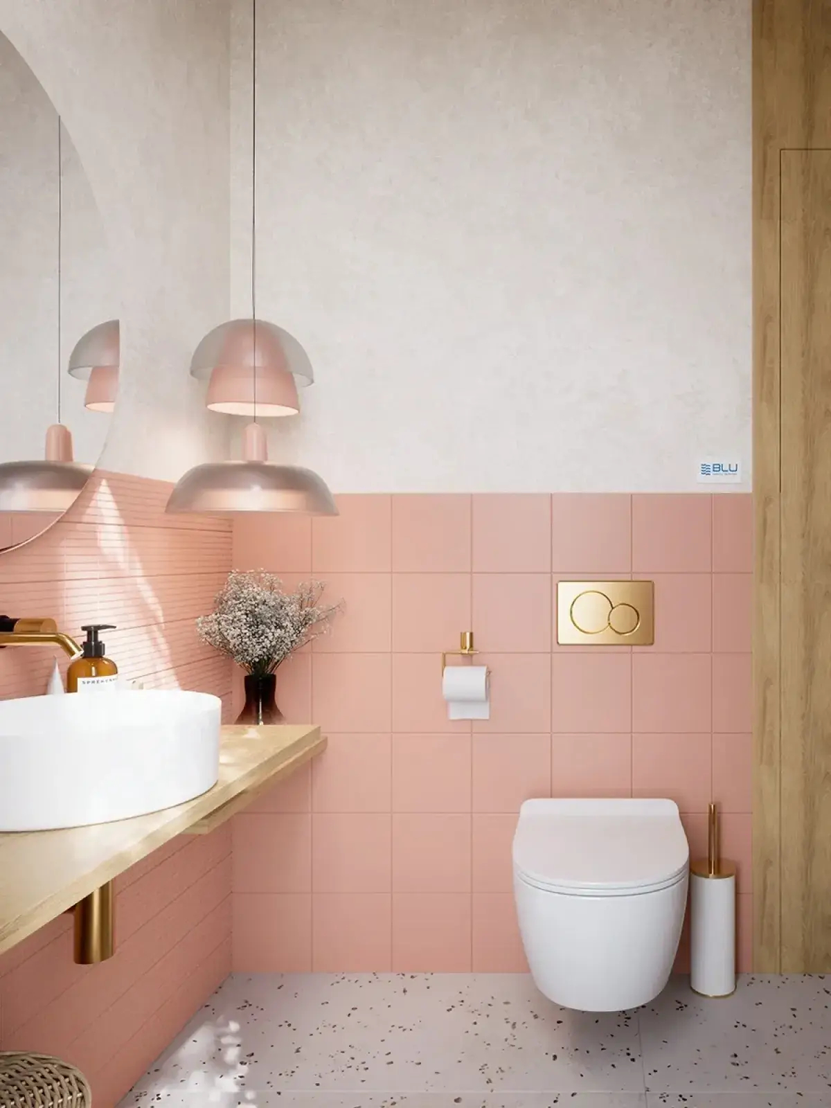 Ma trochę rustykalny charakter, pewnie dzięki temu, że przypomina nieco odcień cegły, kojarzy się z letnimi domami za miastem. Ale wystarczy dodać mu delikatnego pazurka, żeby nabrał miejskiej nowoczesności. Jak to zrobić? Przyjrzyj się naszej inspiracji. W tej pięknej łazience zestawiono dwa rodzaje płytek w tym kolorze. Na podłodze położono matowe, przypominające klinkierowe kafle, a ścianę obłożono szkliwionymi, z pięknym blikiem. Resztę ścian wykończono w odcieniu bardzo jasnego różu. To intrygujące połączenie ma tu swoje wytłumaczenie – rozbielony róż dopasowano do koloru szafki umywalkowej w tonacji znacznie mocniejszego różu. Zestawienie nieoczywiste, może dla niektórych ryzykowne, ale zobaczcie jak te chłodne tony pięknie zagrały z ciepłymi.