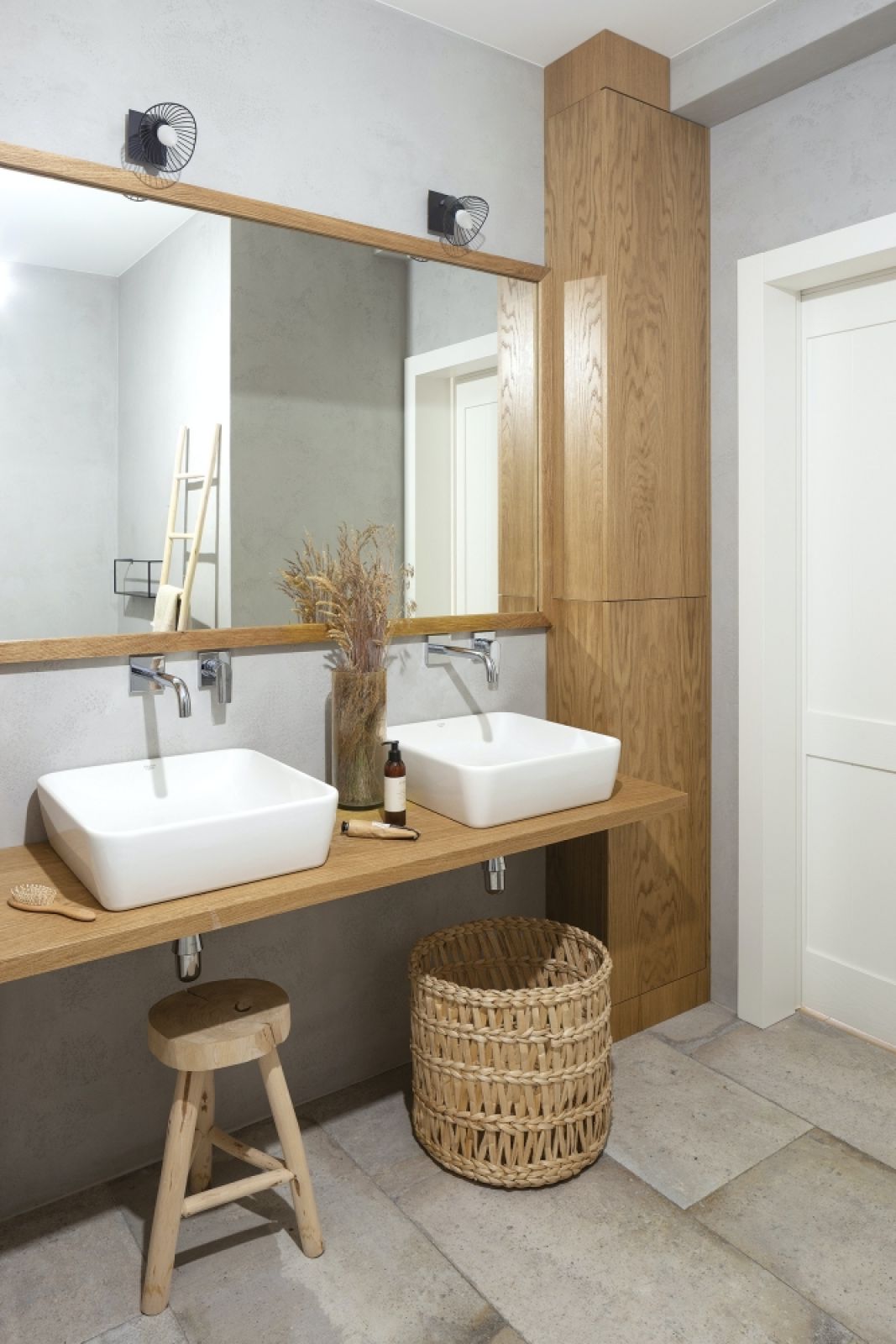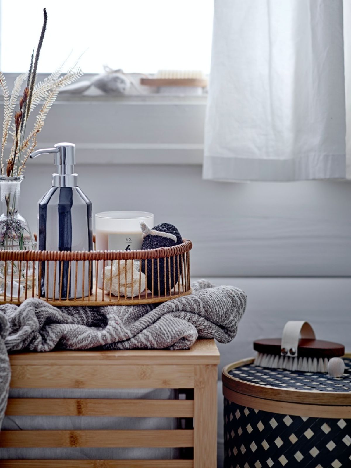 Świetnym rozwiązaniem, które wprowadzi trochę swobody do wnętrz w stylu scandi, jest drabina z szerokimi szczeblami w roli półek. Ustaw na nich pojemniki do przechowywania drobiazgów, połóż ułożone w piramidkę ręczniki lub zawieś tekstylne segregatory na szczotki do włosów, suszarkę, itd. Nie zapomnij też o wiklinowych koszach na pranie.