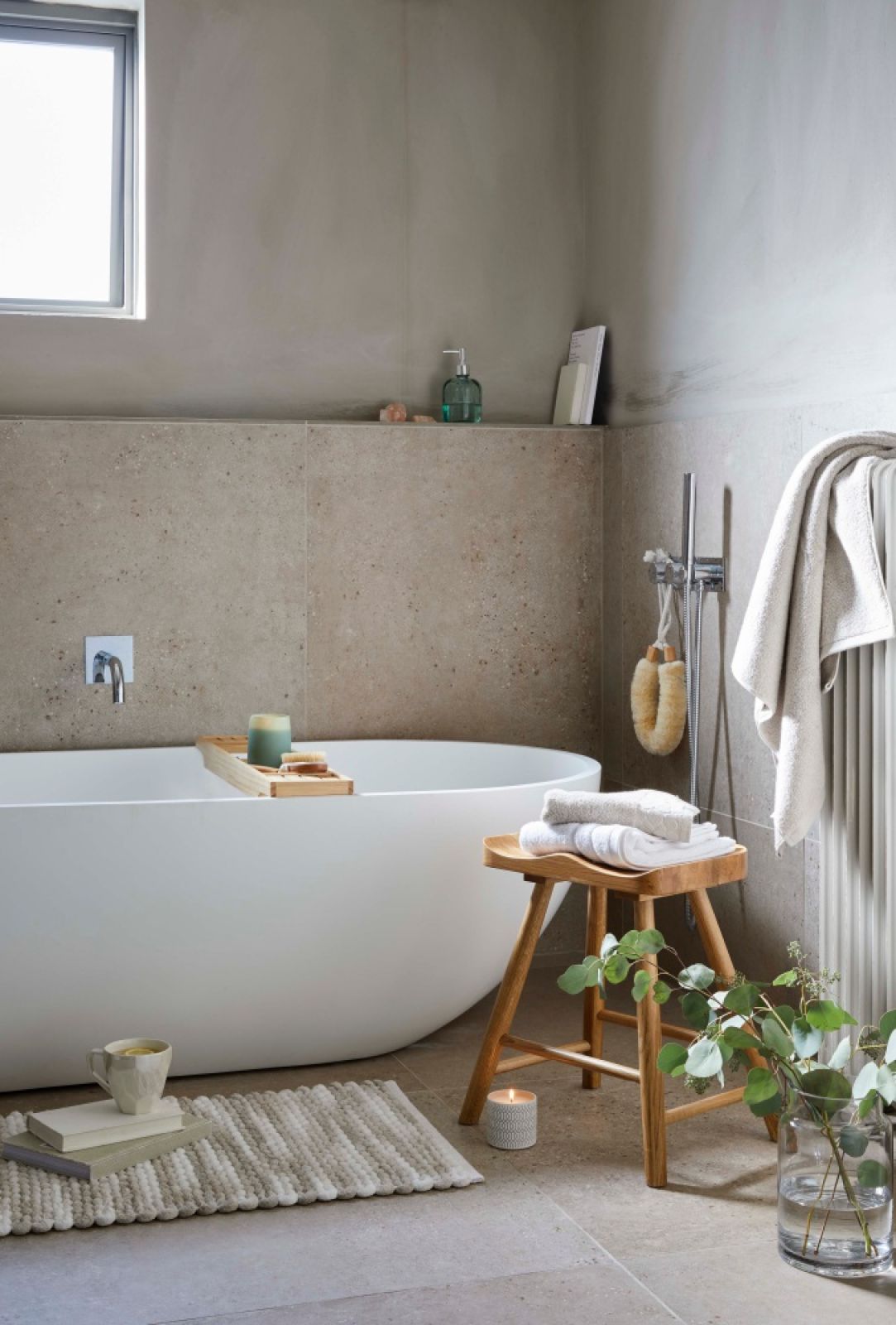 Łazienka w skandynawskim stylu lubi nietypowe rozwiązania, które nieco tuszują jej łazienkowy charakter. Oprócz prostej komody pod umywalkę, egzamin zdają meble i elementy wyposażenia, które równie dobrze wyglądają w salonie w stylu skandynawskim. Koło wanny postaw drewniany stolik, na przykład typu pieniek – najpotrzebniejsze akcesoria muszą się na nim zmieścić, lub… mobilny barek – na kosmetyki, szczotki do masażu, gąbkę… Te poręczne drewniane meble łatwo przestawić, jeśli zajdzie potrzeba, a akcesoria możesz ułożyć na tacy, żeby wszystko było pod ręką. Jeśli masz na to miejsce wstaw designerski fotel lub puf, na który odłożysz ubranie czy ręcznik.