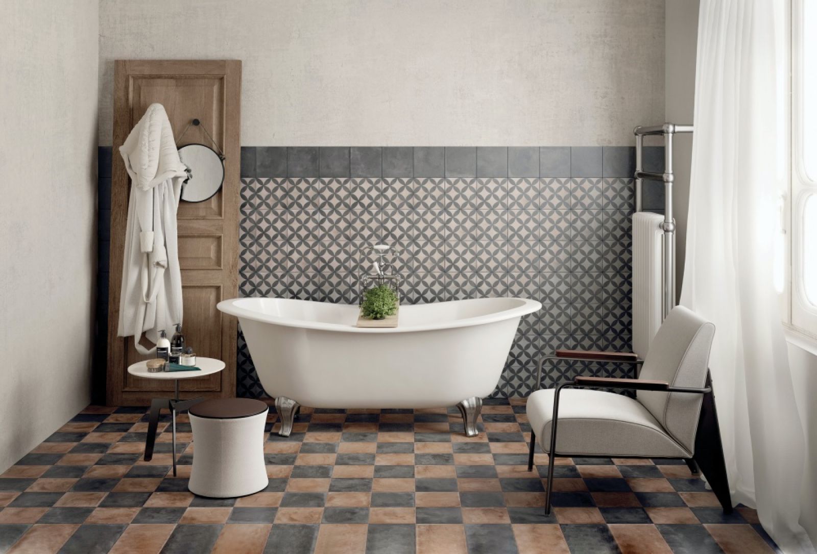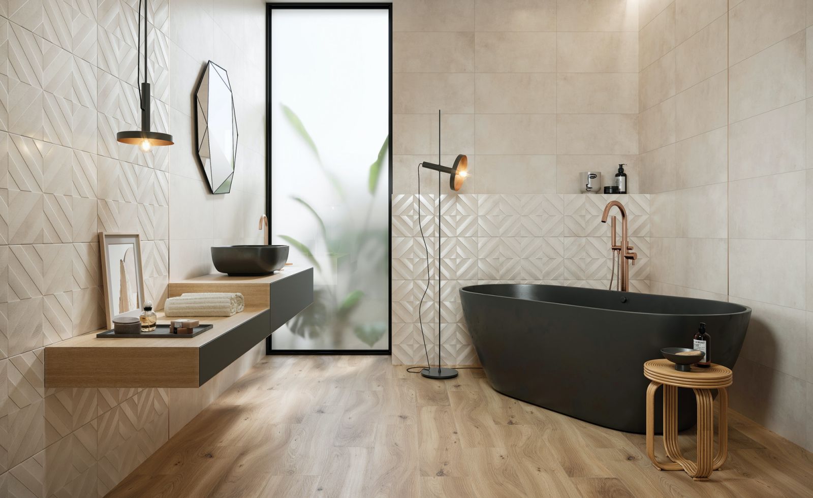 Zdjęcie główne: Strukturalny dekor Fara Taupe Inserto Mat – oryginalne jasne tło dla czarnej wolnostojącej wanny, komfort.pl