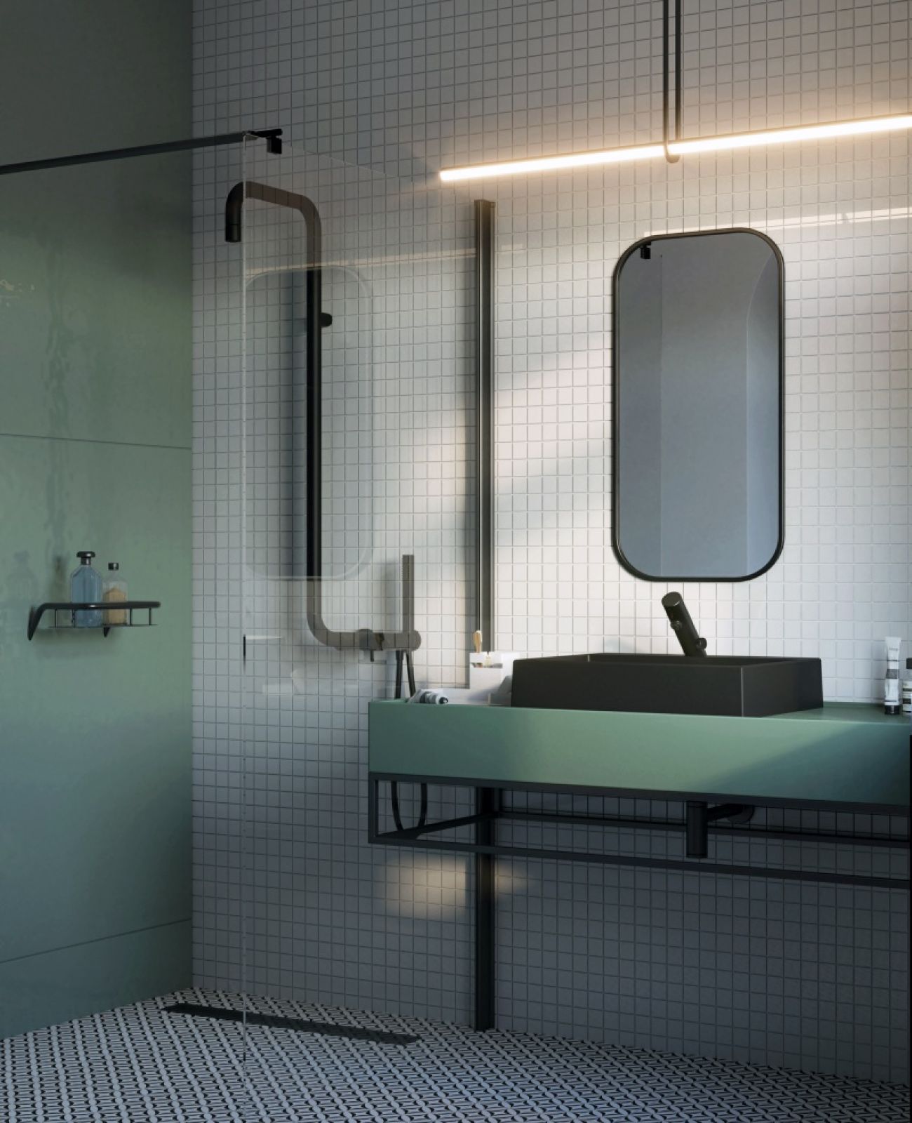 Jeśli chcesz mieć czarne płytki na wszystkich ścianach łazienki, np. do połowy, w postaci lamperii – postaw na gładkie, kwadratowe, a format dobierz do metrażu pomieszczenia.