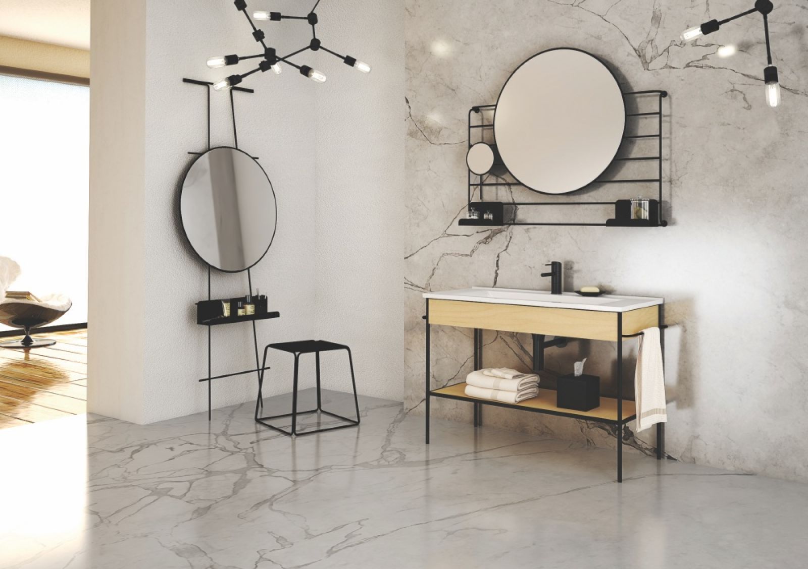 W małej łazience, wbrew pozorom, lepiej zagrają duże formaty – mniej łączeń sprawia wrażenie jednolitej tafli i mniej przytłacza.