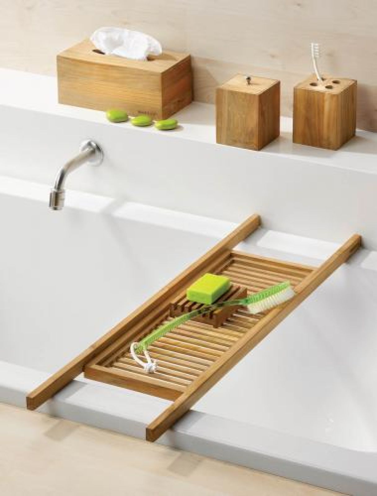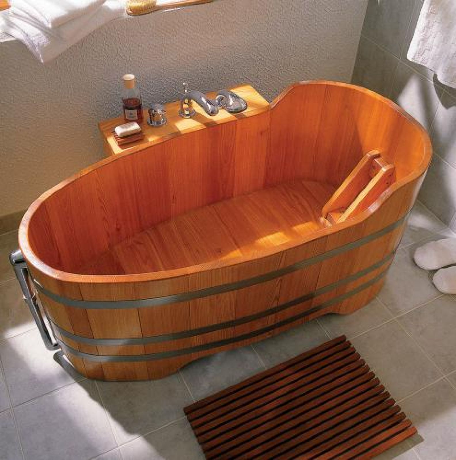 Podłoga z szerokich desek, po których miło chodzić boso, szafki z merbau lub swojskiego buku, ściany ciepłe w dotyku i dziesiątki użytecznych przedmiotów – od wieszaków po mydelniczki, wanny i misy – wszystko z drewna.
